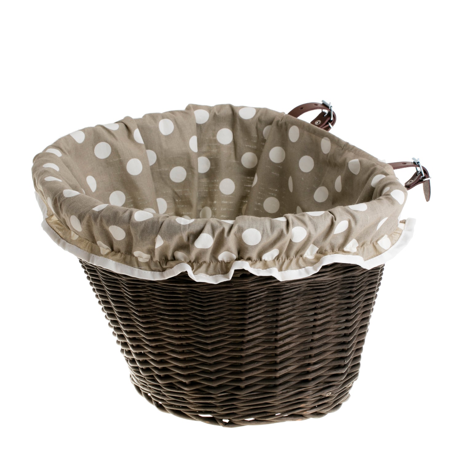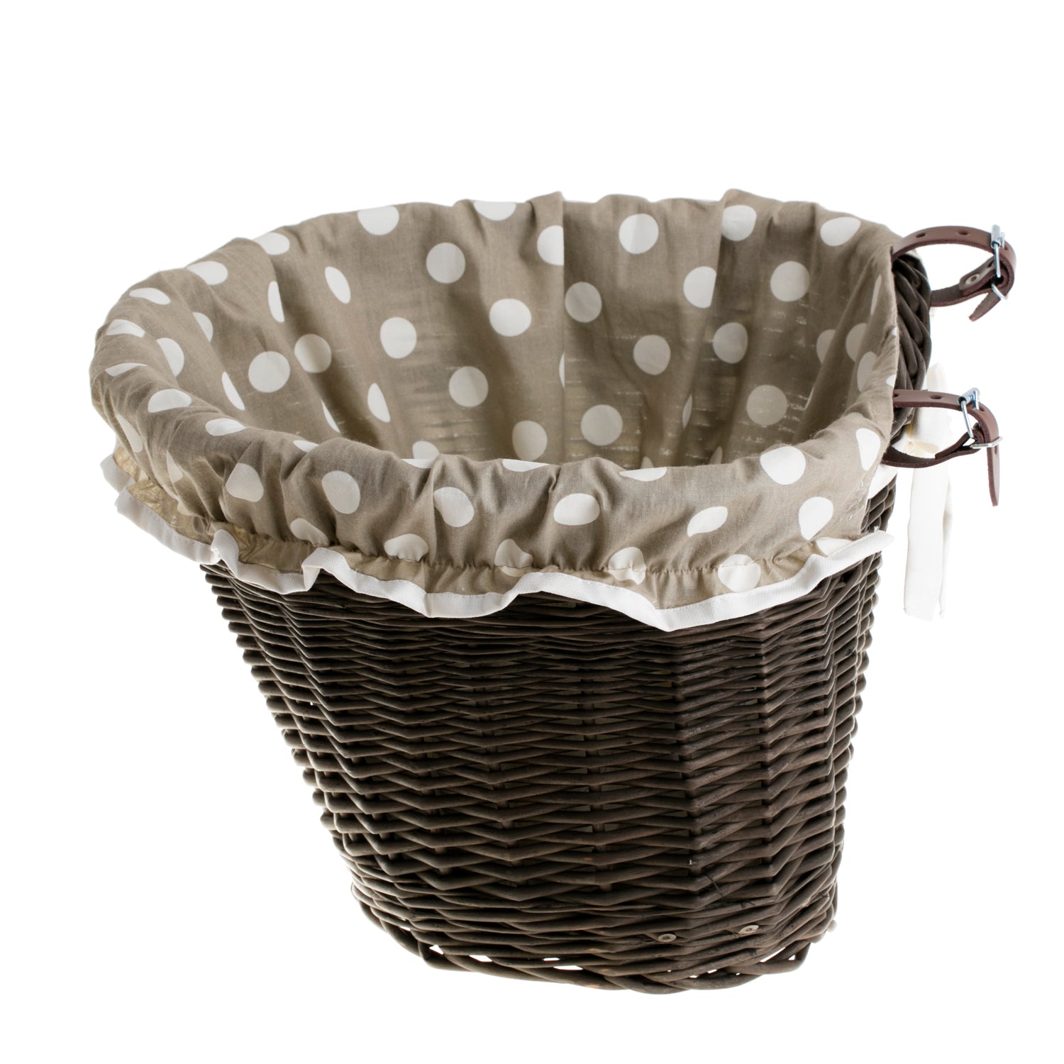 Elegancki kosz wiklinowy na kierownicę dodaje rowerowi klasy i retro uroku. Pleciony gęsto z ciemnobrązowej wikliny, ma stabilny, równy brzeg i subtelnie wyprofilowane ścianki. Wnętrze wyłożono miękkim, beżowym, bawełnianym obszyciem z białą lamówką, które chroni przewożone rzeczy i zapobiega ich obijaniu o splot. Drobne nierówności plecionki podkreślają unikatowy charakter rękodzieła.