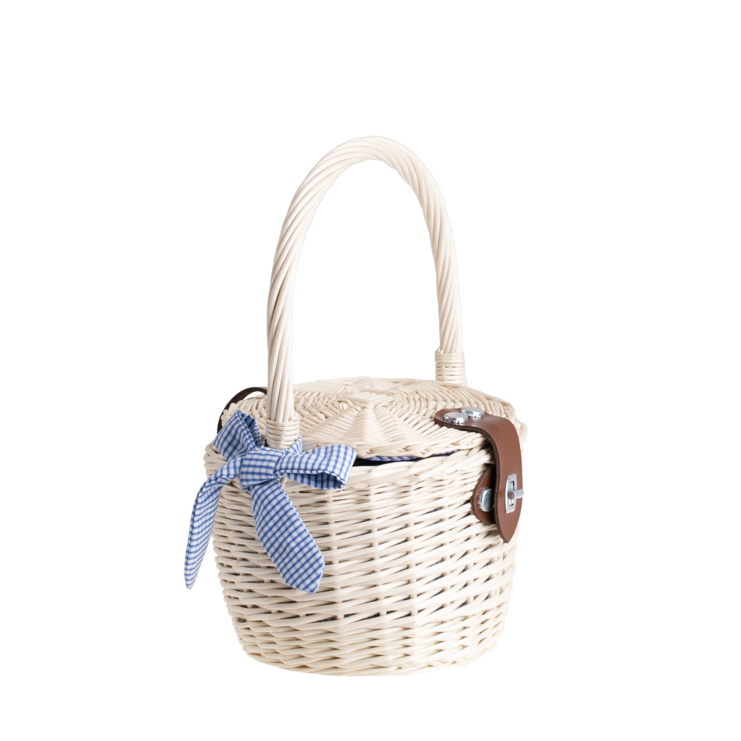 Elegancka wiklinowa torebka łączy klasykę z użytkową wygodą. Korpus wykonany jest z kremowej wikliny o równym, gęstym splocie, który pięknie odbija światło i nadaje całości subtelnego blasku. Wyprofilowana rączka zapewnia pewny chwyt, a stabilne dno pozwala wygodnie odstawić torbę. Wnętrze wykończono obszyciem materiałowym w kolorze niebieskim, które dodaje świeżości. Pokrywa o dekoracyjnym splocie zamykana jest eleganckimi skórzanymi paskami z metalowymi okuciami.