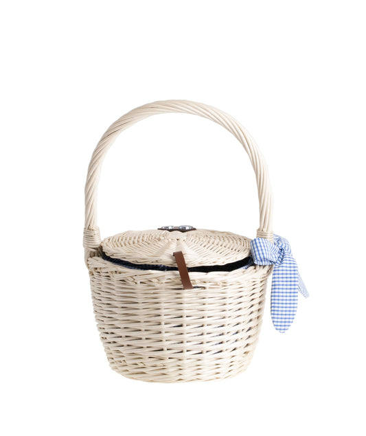 Rivora wiklinowa torebka na plażę i zakupy z niebieskim obszyciem, z pokrywą i rączką TheWickerStories