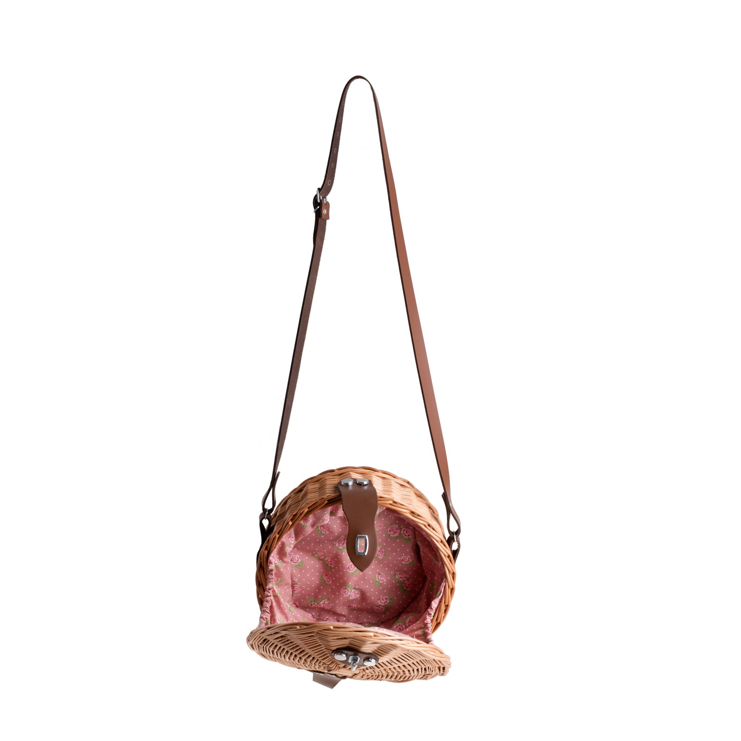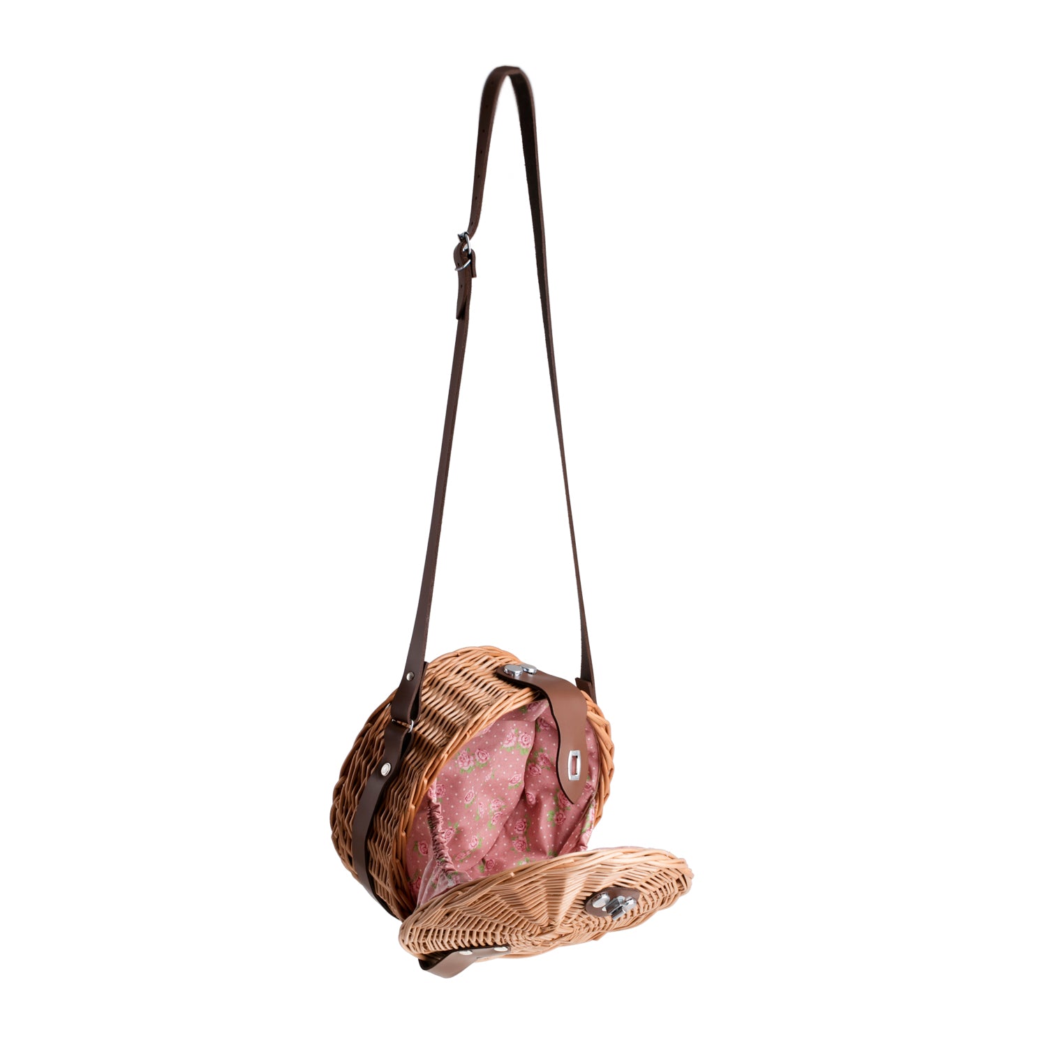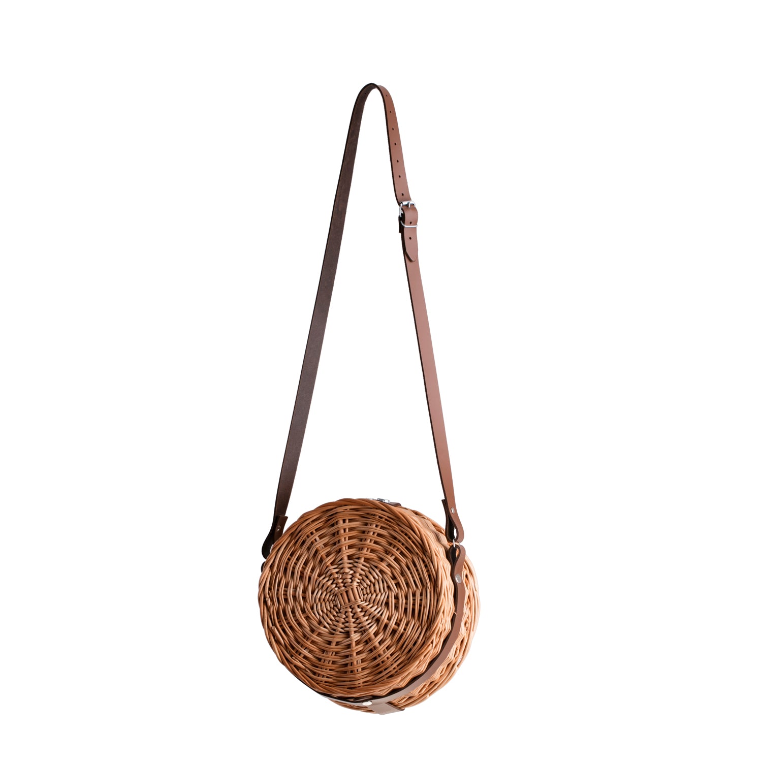 Elegancka wiklinowa torebka o okrągłej, kompaktowej formie zachwyca miodowym odcieniem naturalnej plecionki. Gęsty splot i dekoracyjna, dopasowana pokrywa tworzą spójną całość, chroniąc zawartość. Całość uzupełnia długi, regulowany pasek ze skóry w ciepłym brązie, mocowany nitami i metalowymi okuciami dla pewności noszenia. Subtelne wykończenie krawędzi podkreśla kunszt wykonania. Wnętrze torebki wykończone jest materiałowym obszyciem, które dodaje uroku.