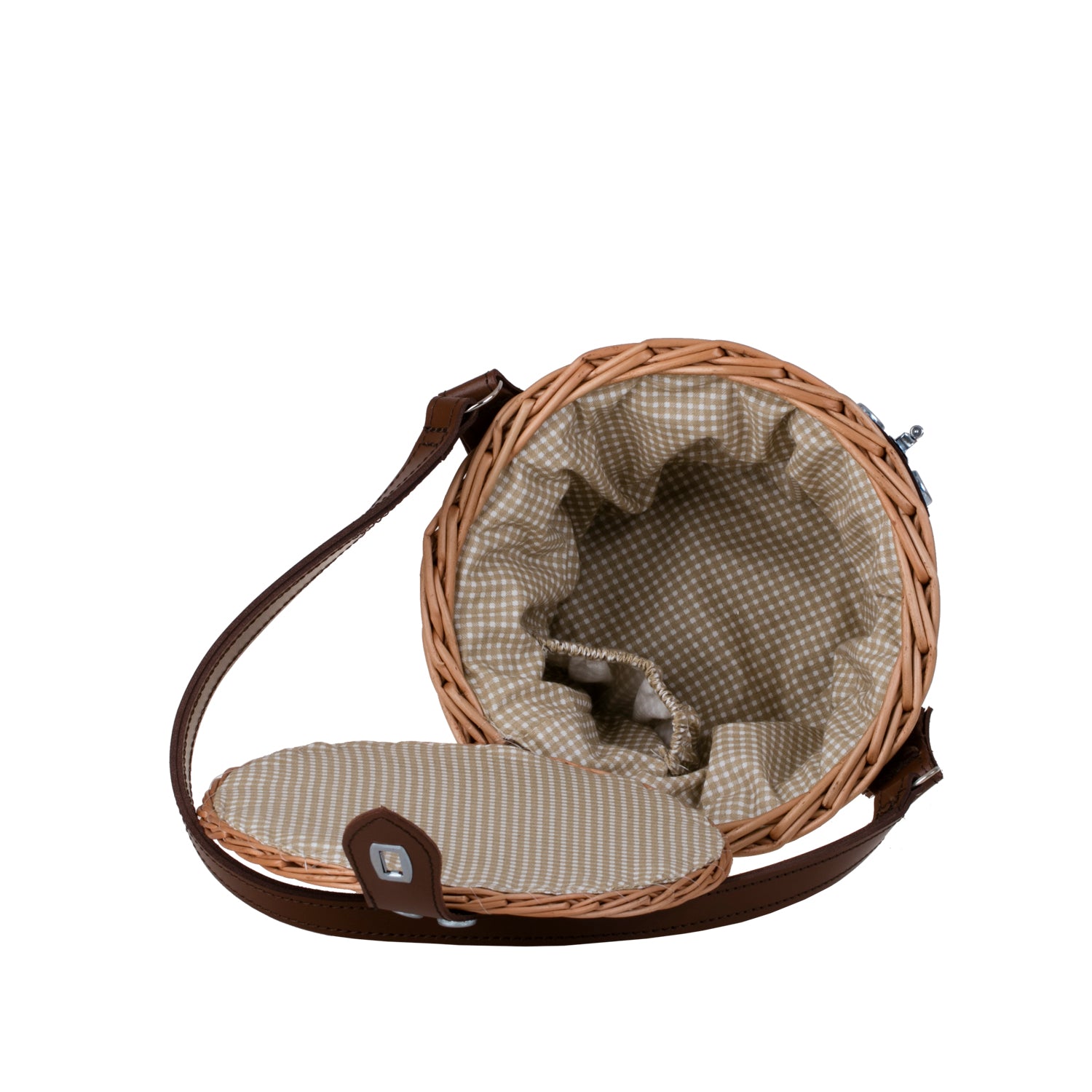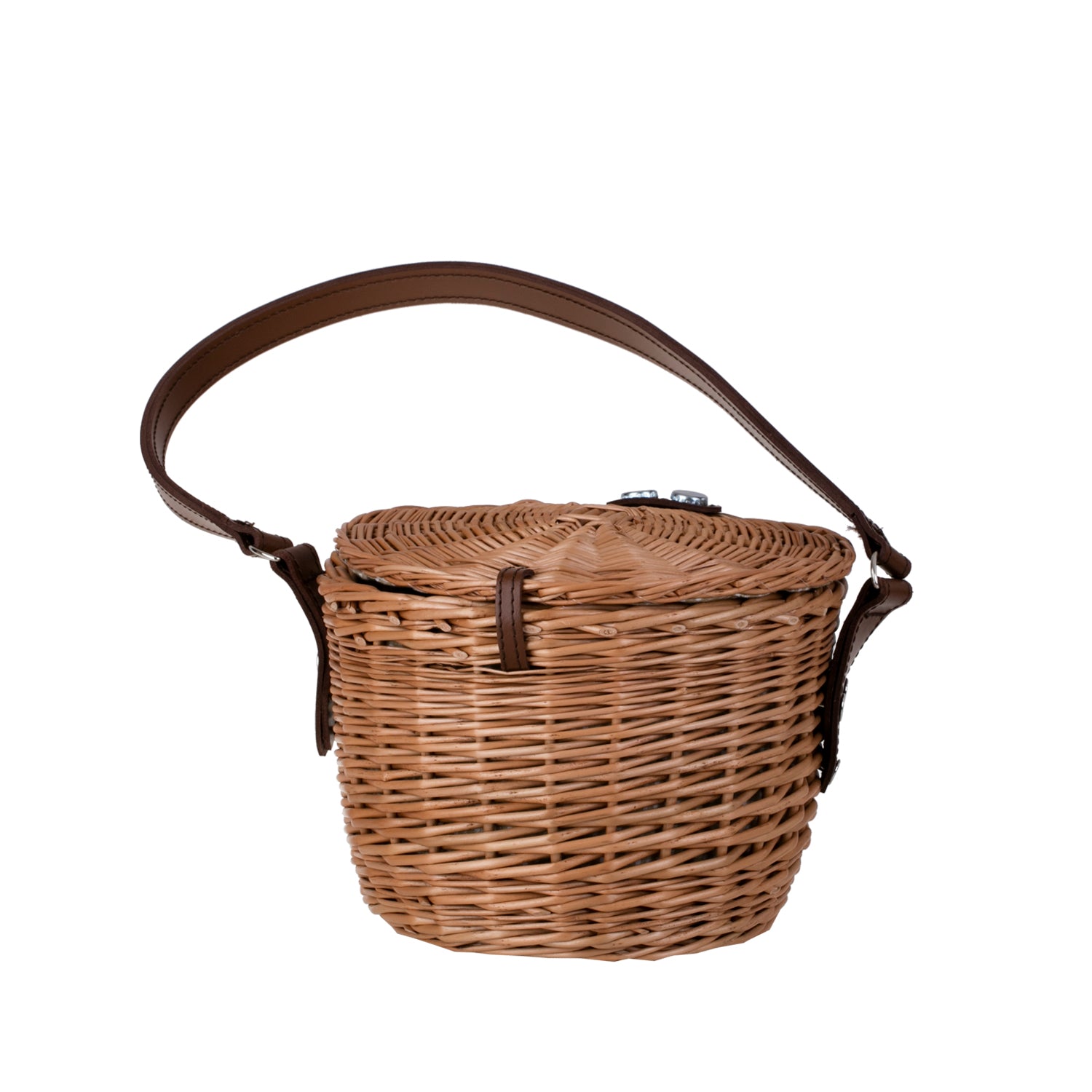 Ta ręcznie pleciona torebka z wikliny zachwyca subtelną, okrągłą formą i równym, gęstym splotem. Naturalny odcień wikliny harmonizuje ze skórzanymi detalami, tworząc elegancki, ponadczasowy charakter. Górna pokrywa z dekoracyjnym splotem zamykana jest na metalową klamrę umieszczoną na skórzanym języku, co skutecznie chroni zawartość. Regulowany, miękko wykończony pasek na ramię zapewnia wygodę w drodze. Wnętrze torebki wykończone jest materiałowym obszyciem w drobną kratkę, które dodaje uroku i chroni zawartość. Równoległe, zwarte przeploty zapewniają przyjemną w dotyku powierzchnię i wysoką odporność na odkształcenia, a satynowy połysk okuć subtelnie kontrastuje z naturalną fakturą wikliny.