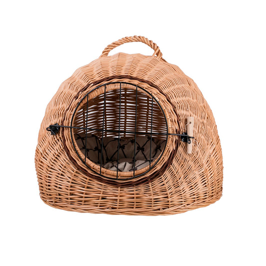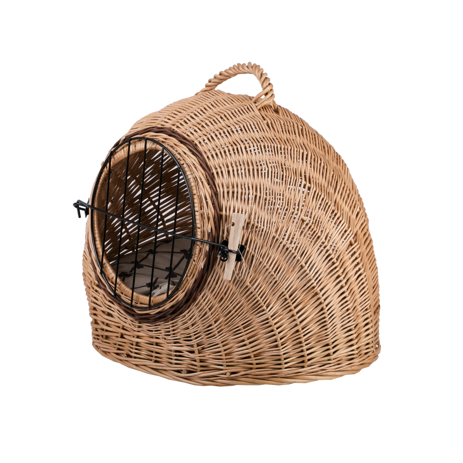 Tactus wiklinowy domek dla kota z poduszką, z uchwytem i metalowymi drzwiczkami TheWickerStories