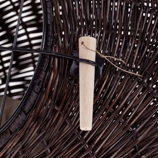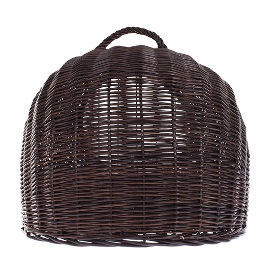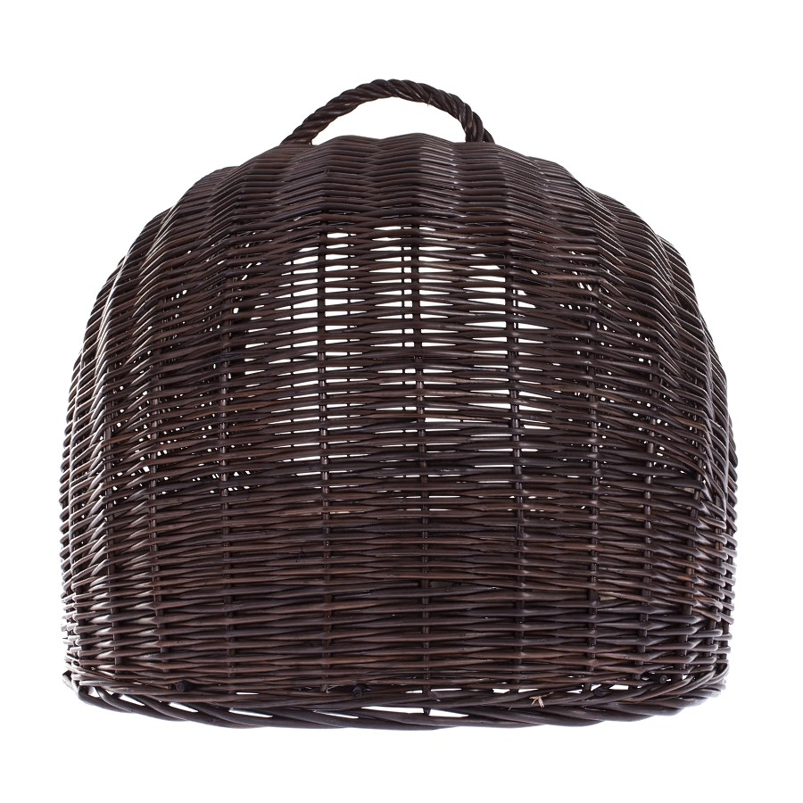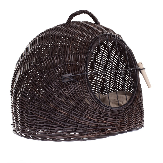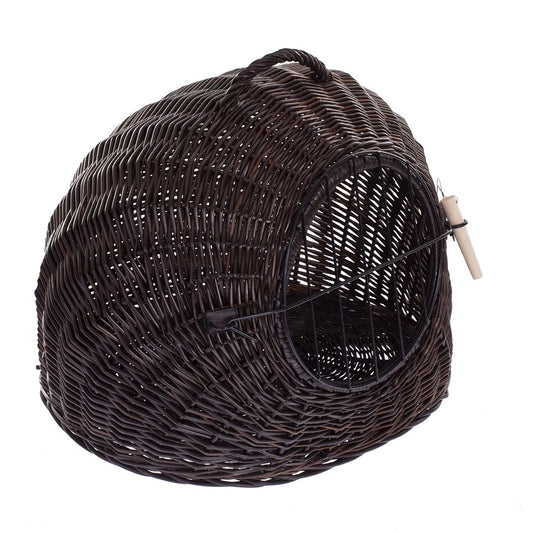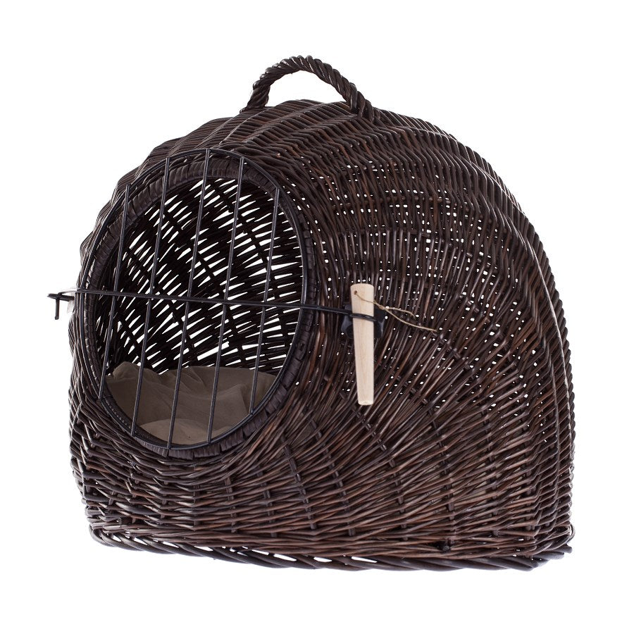 Elegancki domek dla kota ma zaokrąglony, kopułowy profil i został wypleciony z gęsto prowadzonej wikliny w głębokim, ciemnobrązowym odcieniu wenge. Front wieńczy duży, okrągły otwór z solidnymi drzwiczkami w formie metalowej kratki, blokowanymi drewnianym kołkiem. Na górze znajduje się pewny, pleciony uchwyt do przenoszenia. W środku leży miękka, wyjmowana poduszka, a równy spód dba o stabilność na podłodze.