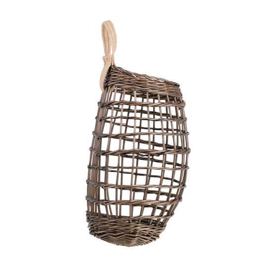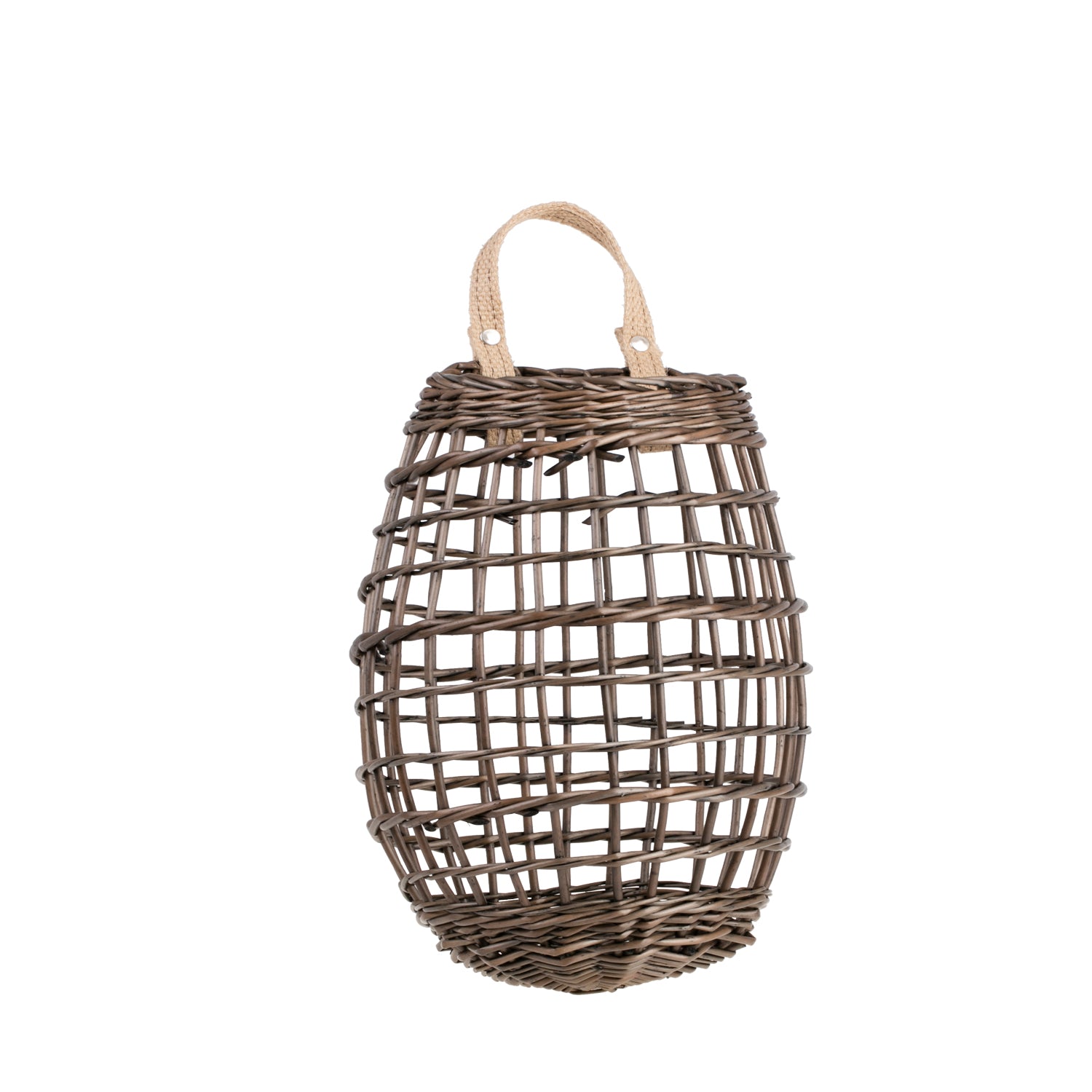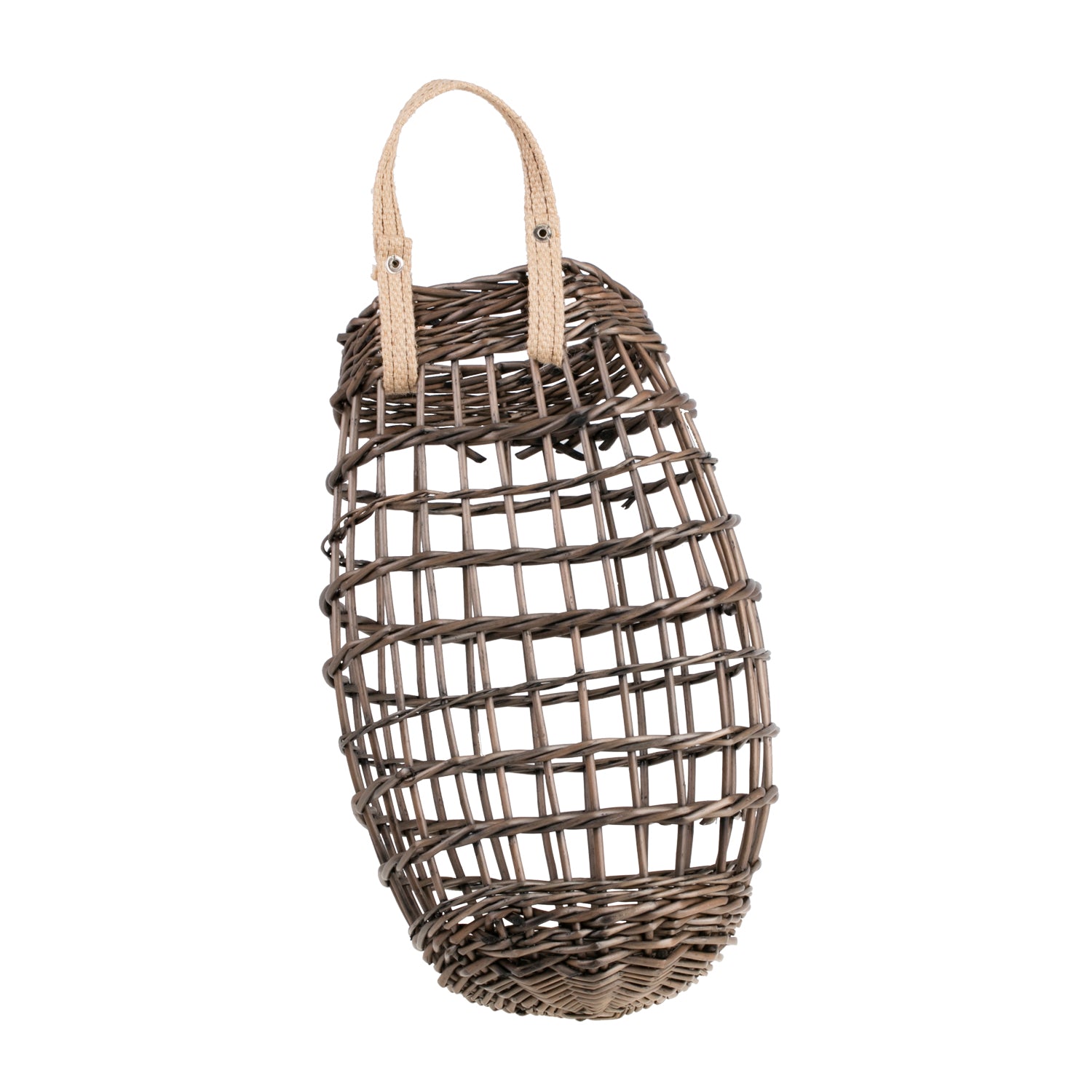 Wyrazisty, ażurowy kosz wiklinowy w kolorze ciemnego brązu przyciąga wzrok otwartym splotem i starannie wykończonym brzegiem. Smukła, lekko pękata forma podkreśla dekoracyjny charakter, a gęstszy splot u dołu zabezpiecza zawartość. Na górze znajduje się miękki, jutowy uchwyt ułatwiający zawieszenie i przenoszenie. Regularne oczka siatki eksponują wnętrze, a kontrast naturalnej juty dodaje mu subtelnego, rzemieślniczego uroku.