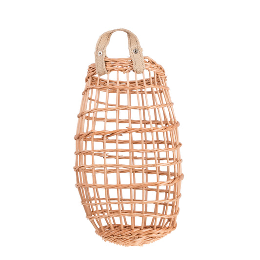 Przewiewna konstrukcja sprawia, że to idealny kosz do ekspozycji świeżych owoców i warzyw. Ażurowe ścianki pozwalają produktom oddychać, a wyższe krawędzie chronią zawartość przed wypadaniem. Jutowy uchwyt ułatwia przenoszenie między regałami oraz zawieszenie na haczyku, wieszaku lub stojaku. Wymiary: średnica ok. 24 cm; wysokość 41 cm (51 cm z uchwytem).