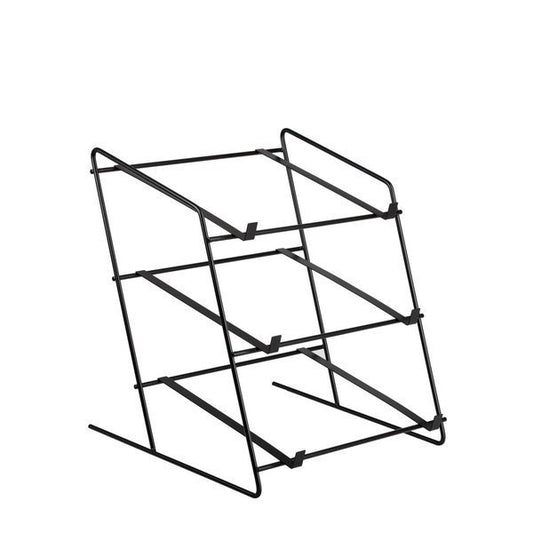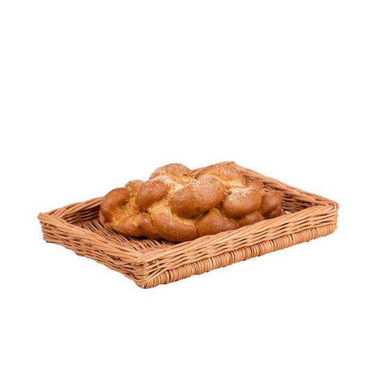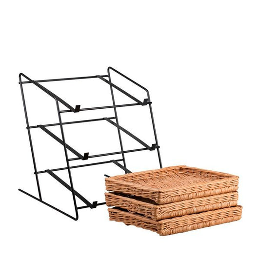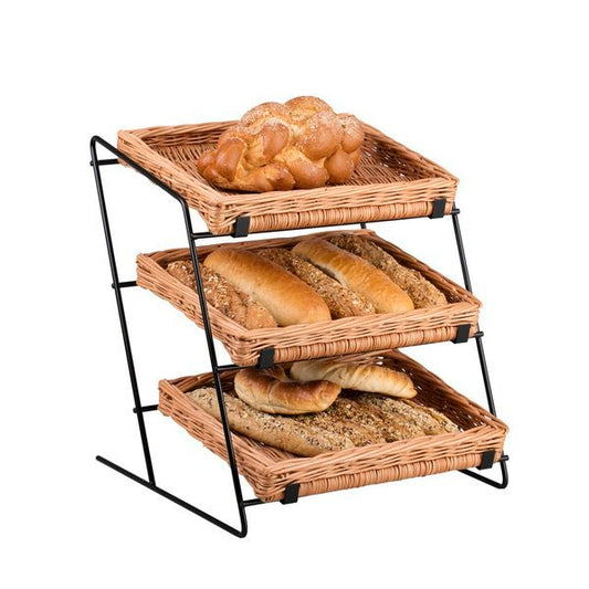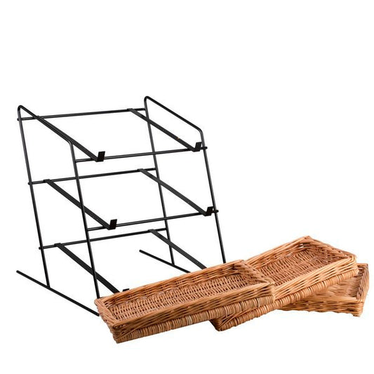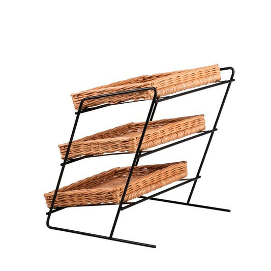 Trzypoziomowy stojak ekspozycyjny łączy naturalną wiklinę z czarną metalową ramą. Na lekkim stelażu osadzono trzy płytkie, prostokątne koszyki o równym splocie, które dobrze pokazują zawartość. Ciepły odcień wikliny ociepla przestrzeń. Delikatne wykończenie rantów chroni produkty i nadaje całości elegancki charakter. Stojak: 44 × 47 cm, wys. 42/48 cm; koszyki: 40 × 30 × 7 cm.