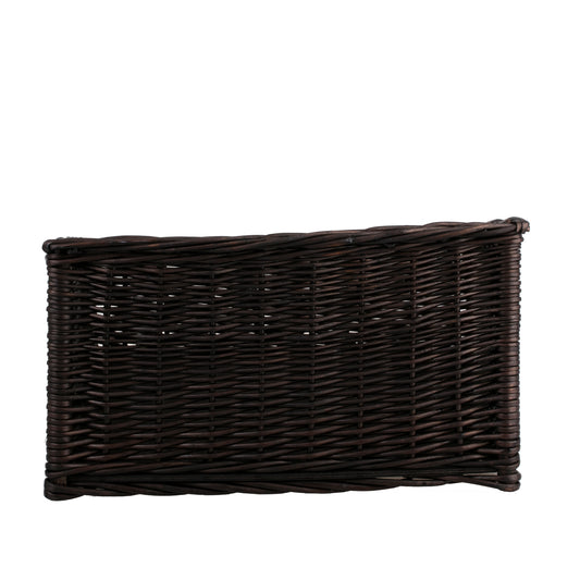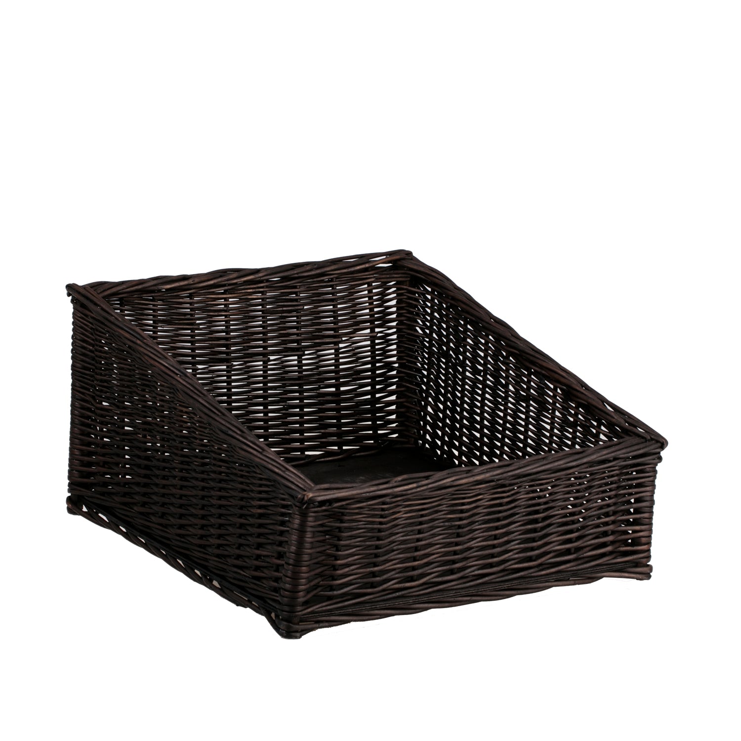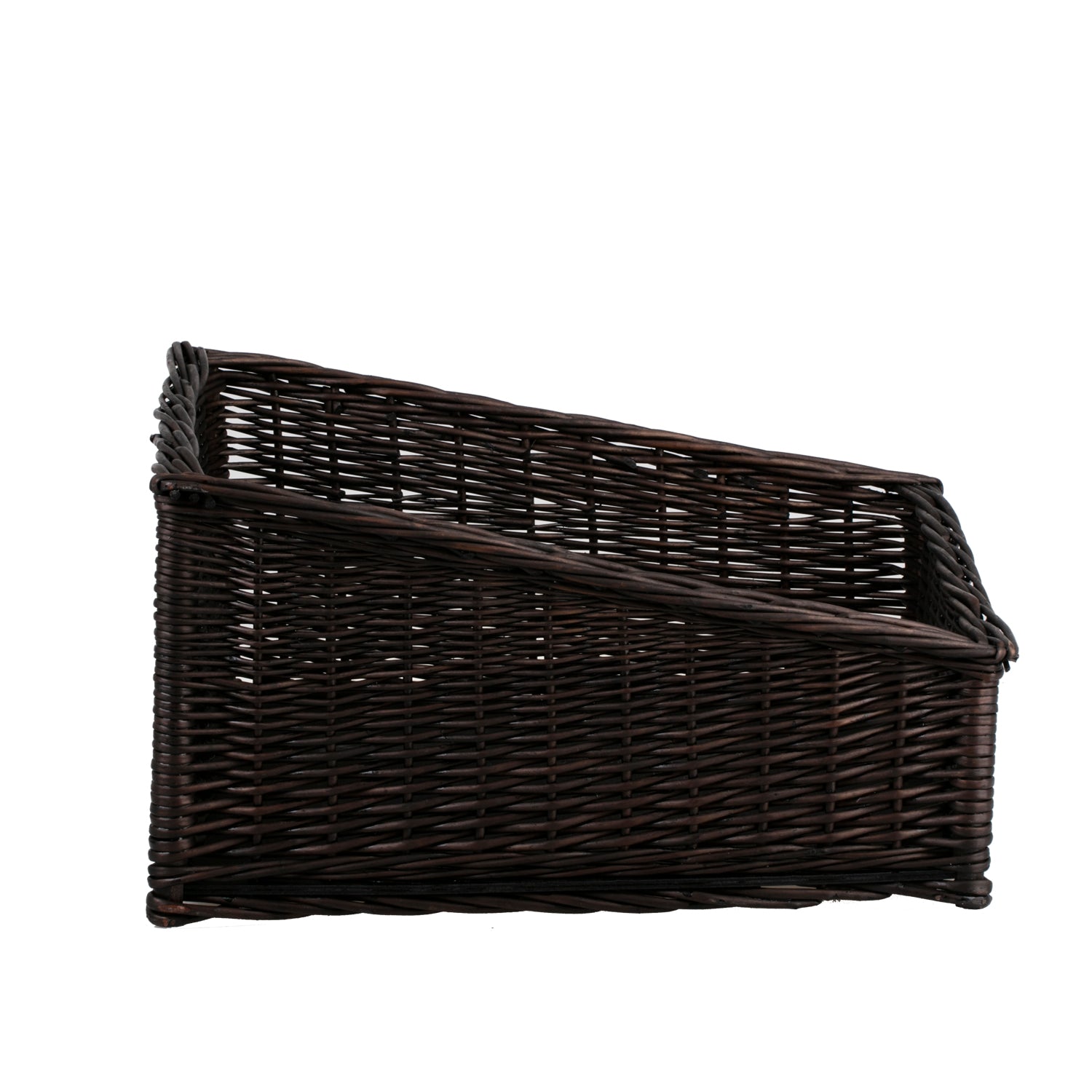 Elegancki kosz ekspozycyjny z wikliny wyróżnia głęboki, ciemnobrązowy odcień wenge. Gęsty, równy splot tworzy solidne ścianki; tył jest wyższy, a front obniżony dla łatwego dostępu. Płaskie dno zapewnia stabilność na ladzie lub blacie. Brak uchwytów i obszycia podkreśla czystą, profesjonalną formę.
