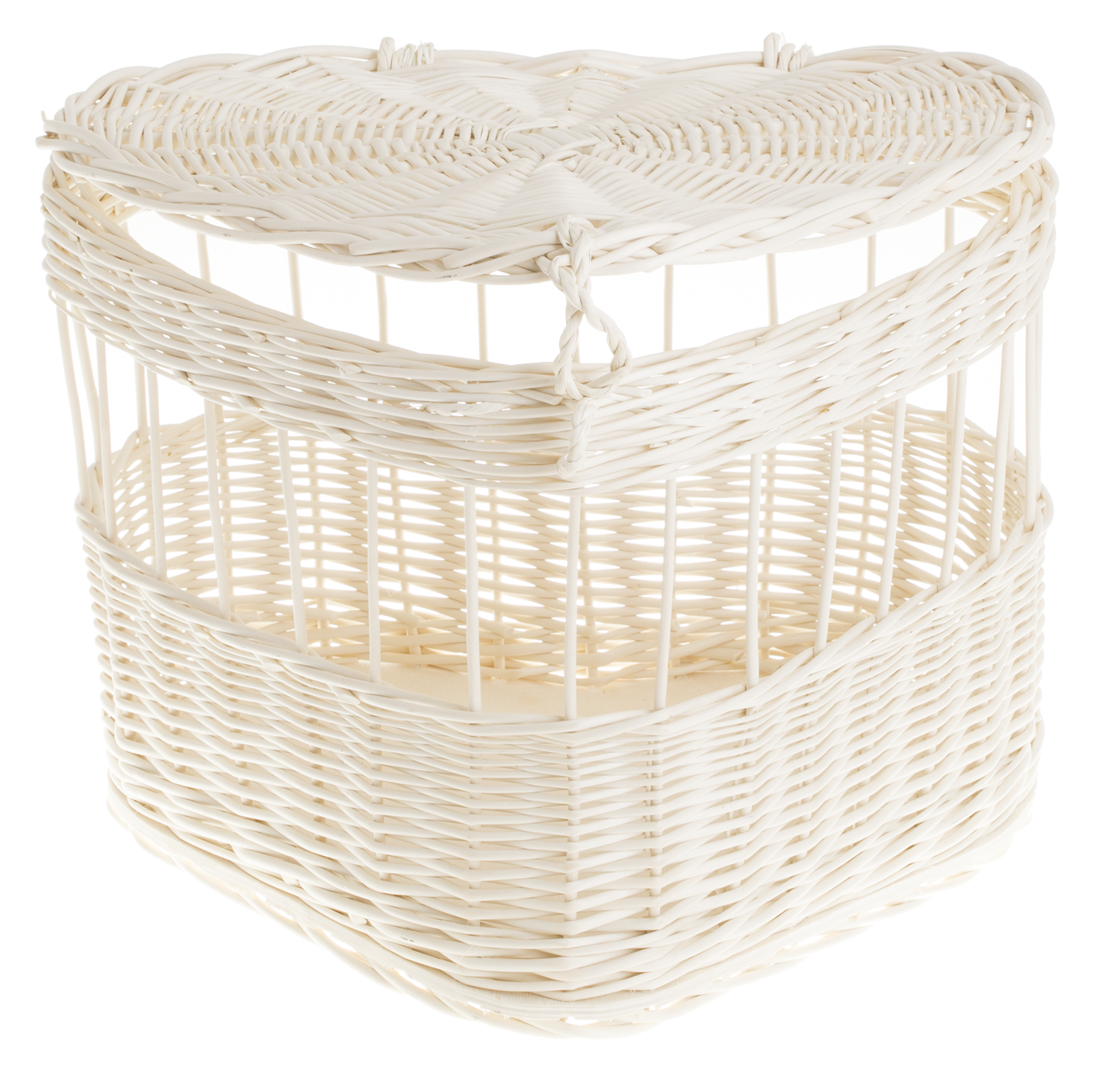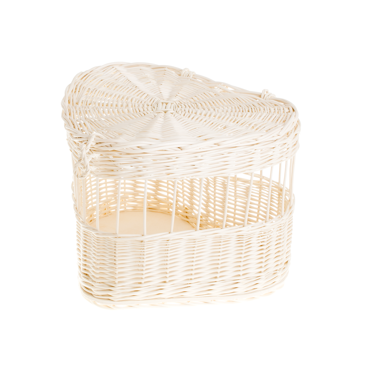Elegancki wiklinowy transporter dla gołębi zachwyca kremowym odcieniem i starannym, równym splotem. Korpus ma romantyczną formę serca z miękko poprowadzonymi krawędziami. Górę wieńczy pełna, wytrzymała pokrywa z dekoracyjnym, promienistym wzorem. Ażurowe ścianki i zagęszczony splot u podstawy gwarantują lekkość oraz stabilność. Regularność prętów podkreśla dbałość o detale.