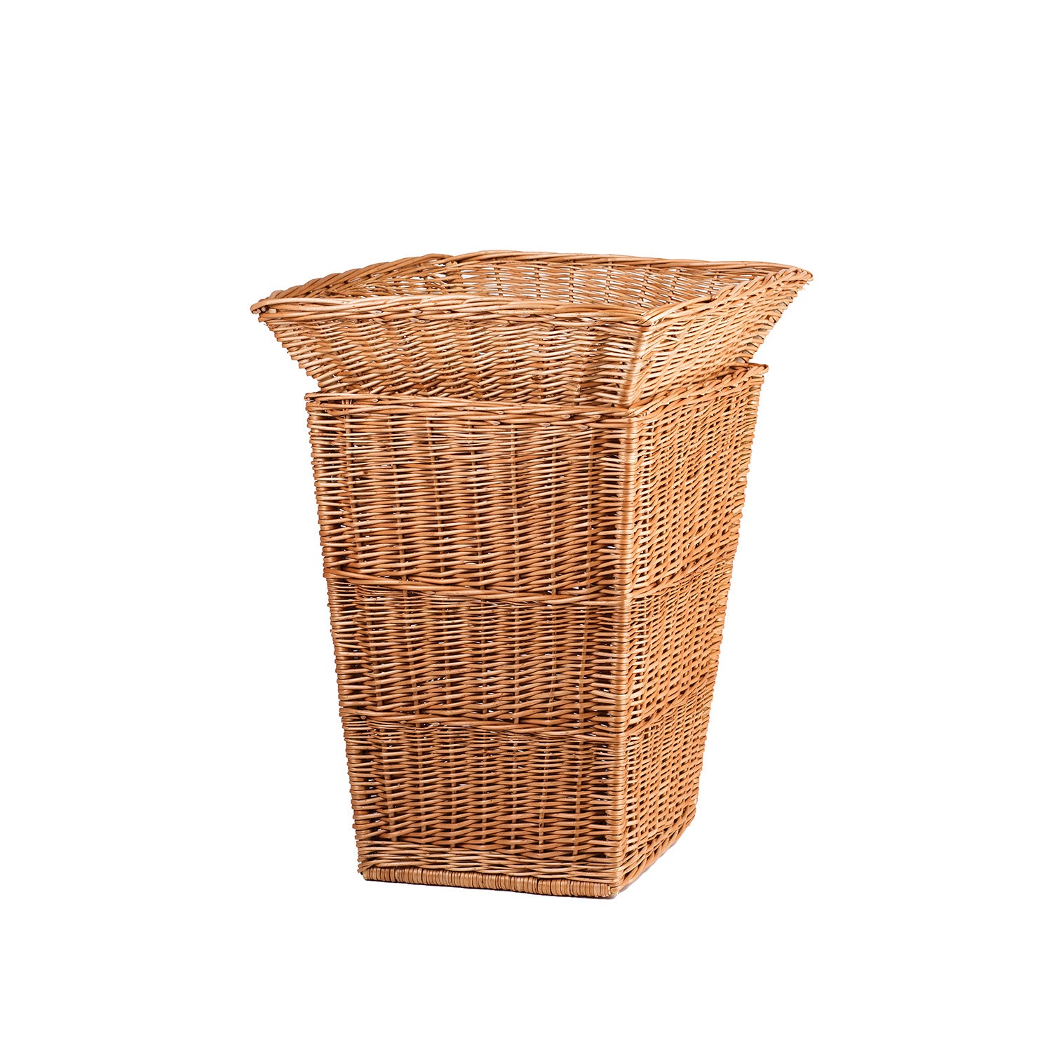 Wysoki kosz ekspozycyjny z wikliny wyróżnia się smukłą konstrukcją i szerokim, lekko rozchylonym rantem u góry, który ułatwia dostęp do zawartości. Pionowe ścianki tworzy gęsty, równy splot, a krawędzie są starannie wykończone. Brak uchwytów i obszycia porządkuje formę, dzięki czemu produkt wygląda czysto i profesjonalnie na każdym stoisku.
