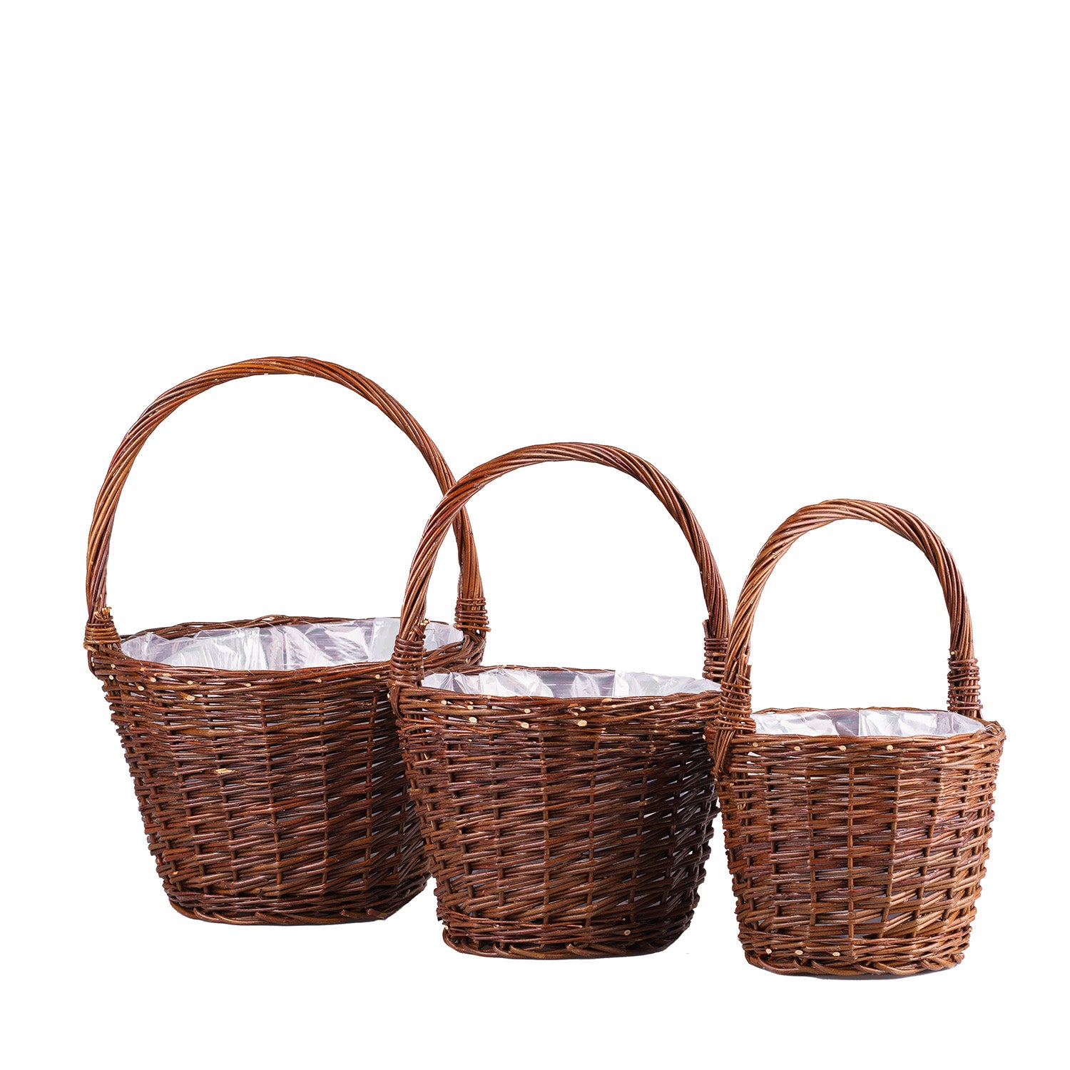 Zestaw trzech wiklinowych koszy ogrodowych zachwyca ciemnobrązowym wybarwieniem i równym, starannym splotem. Każdy kosz ma wysoką, solidną rączkę ułatwiającą przenoszenie oraz wyłożone wnętrze z folią, która oddziela ziemię od plecionki. Okrągła linia i subtelne zagęszczenia splotu nadają im elegancki, rustykalny charakter idealny na taras, balkon i parapet.
