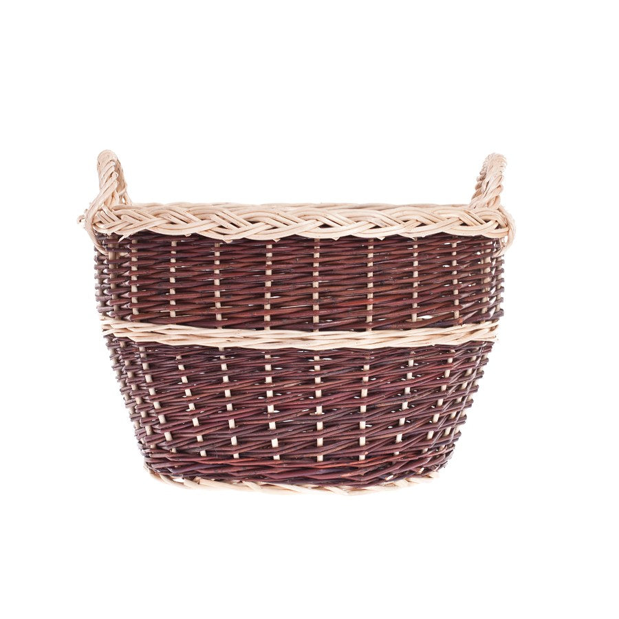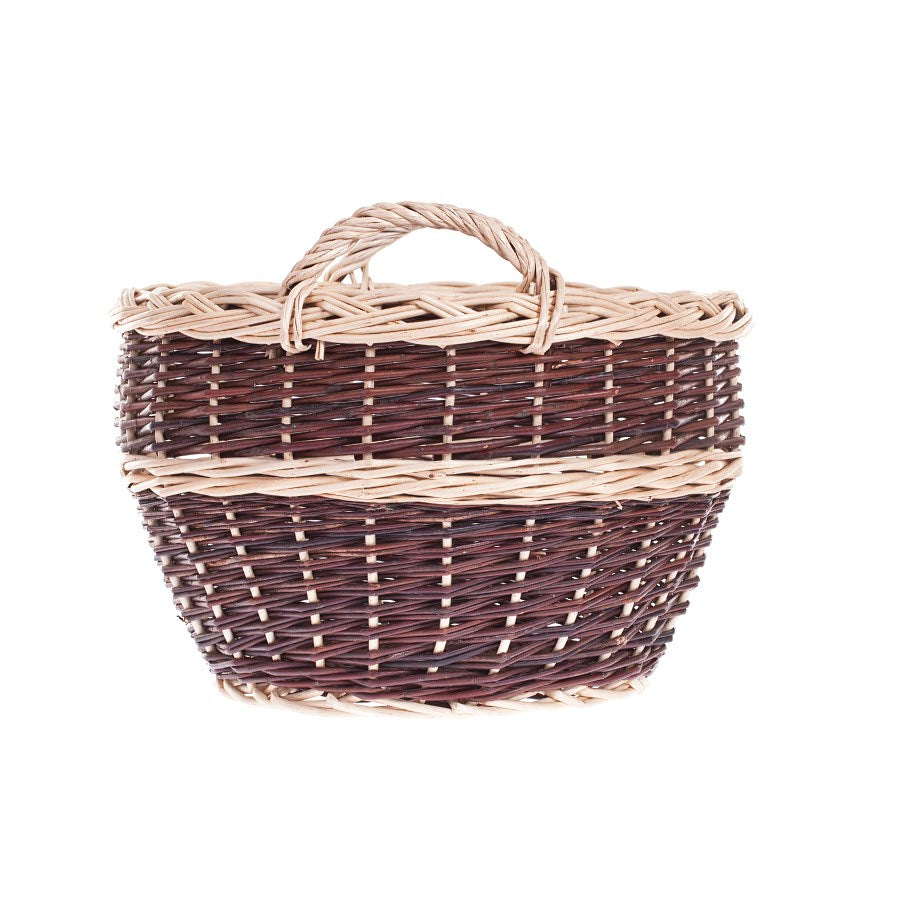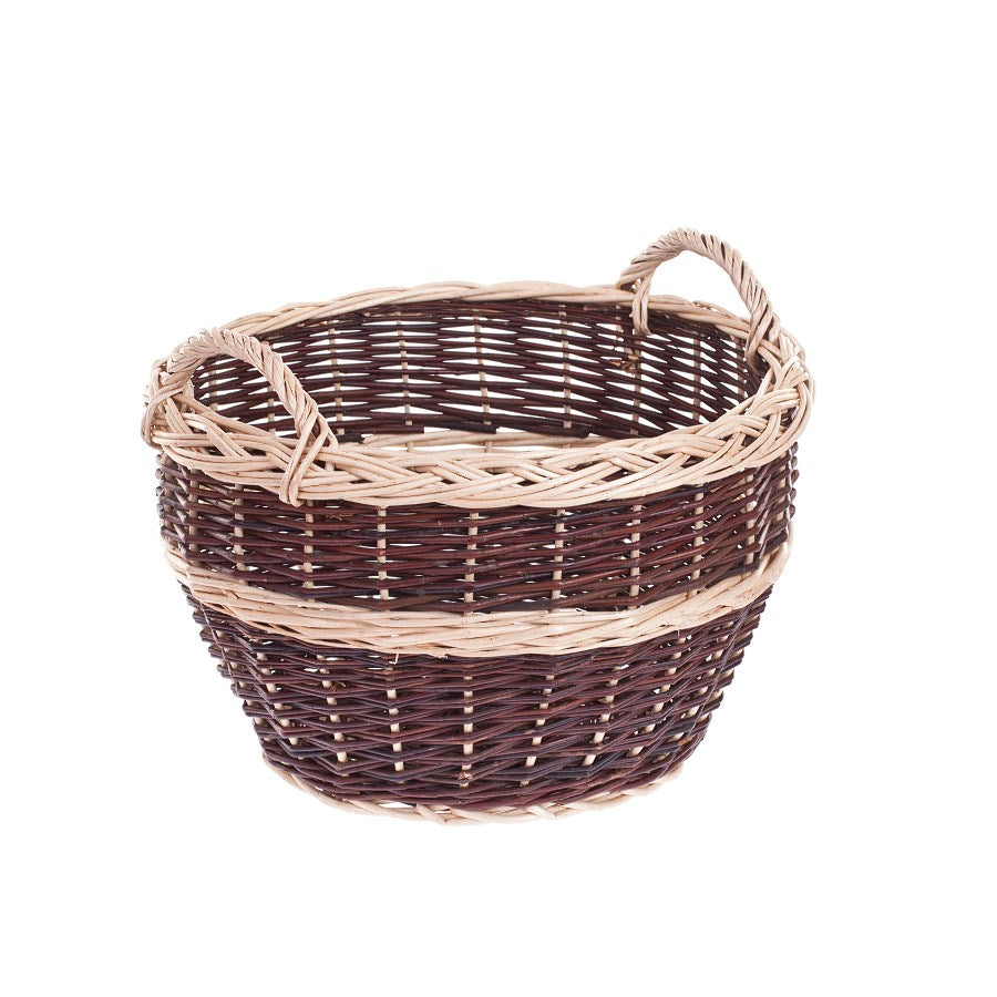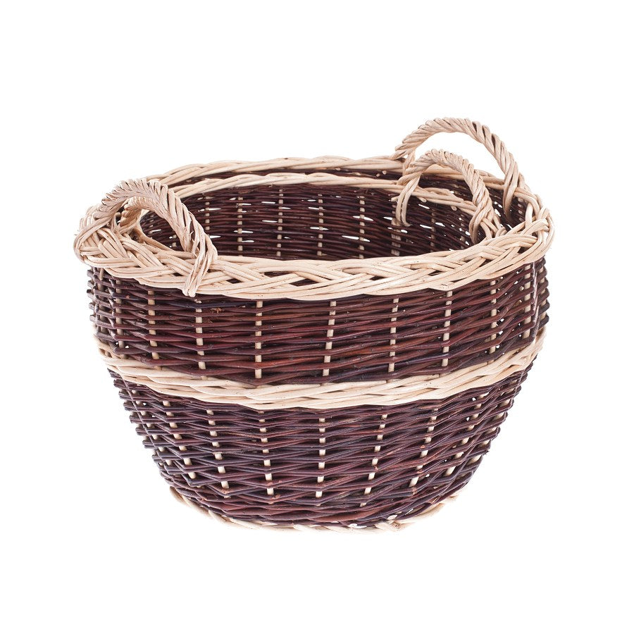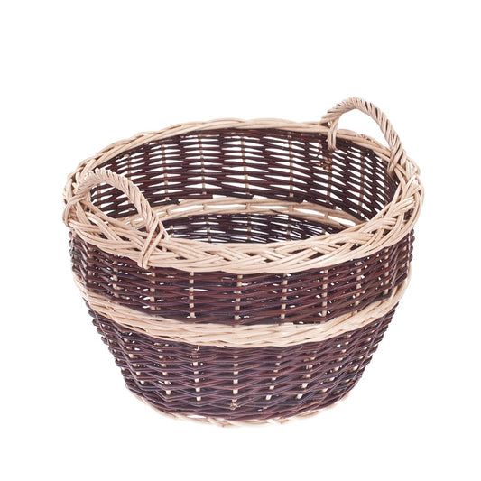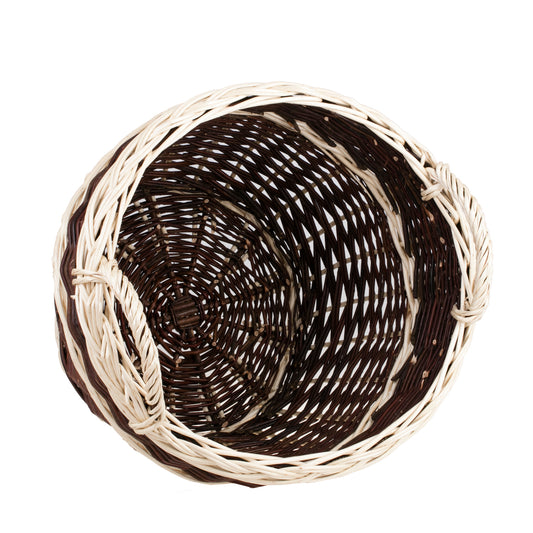 Ten wiklinowy kosz ogrodowy zachwyca dopracowanym, dwukolorowym splotem: ciemne, głębokie pręty przeplatają się z jasnymi pasami i efektownie plecionym rantem. Okrągły, lekko rozszerzający się ku górze profil zapewnia dużą pojemność i wygodny dostęp. Na krawędzi biegnie ozdobny warkocz, a stabilna podstawa gwarantuje pewne ustawienie.