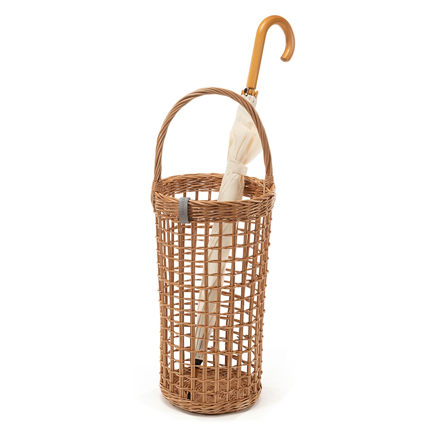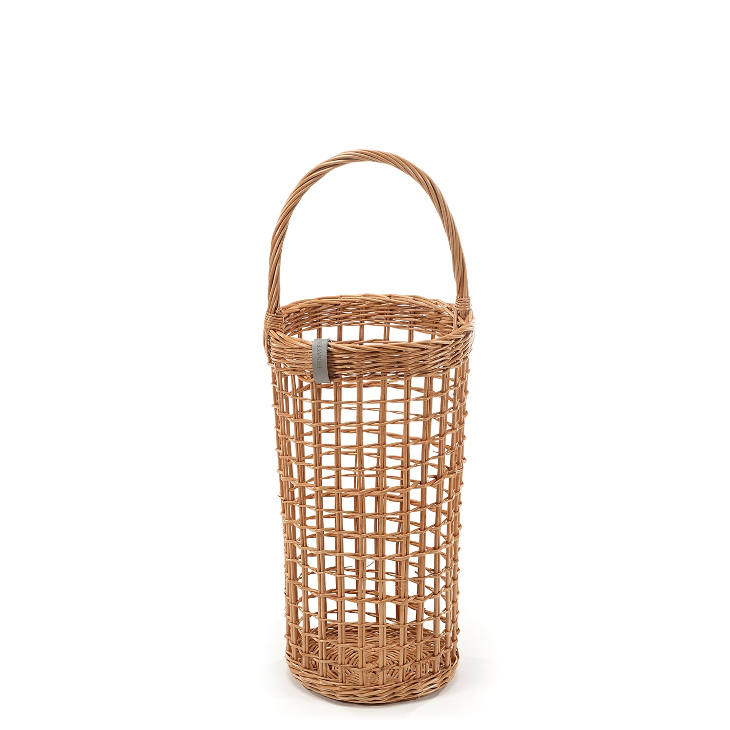 Minimalistyczny stojak DESAYER zachwyca lekką, ażurową plecionką. Cylindryczna forma z gęściej wyplecionym dnem i wzmocnioną obręczą pewnie utrzymuje parasole. Łukowaty uchwyt ułatwia przenoszenie, a gładko wykończone krawędzie chronią tkaniny. Naturalny, miodowy odcień wikliny ociepla wejście.