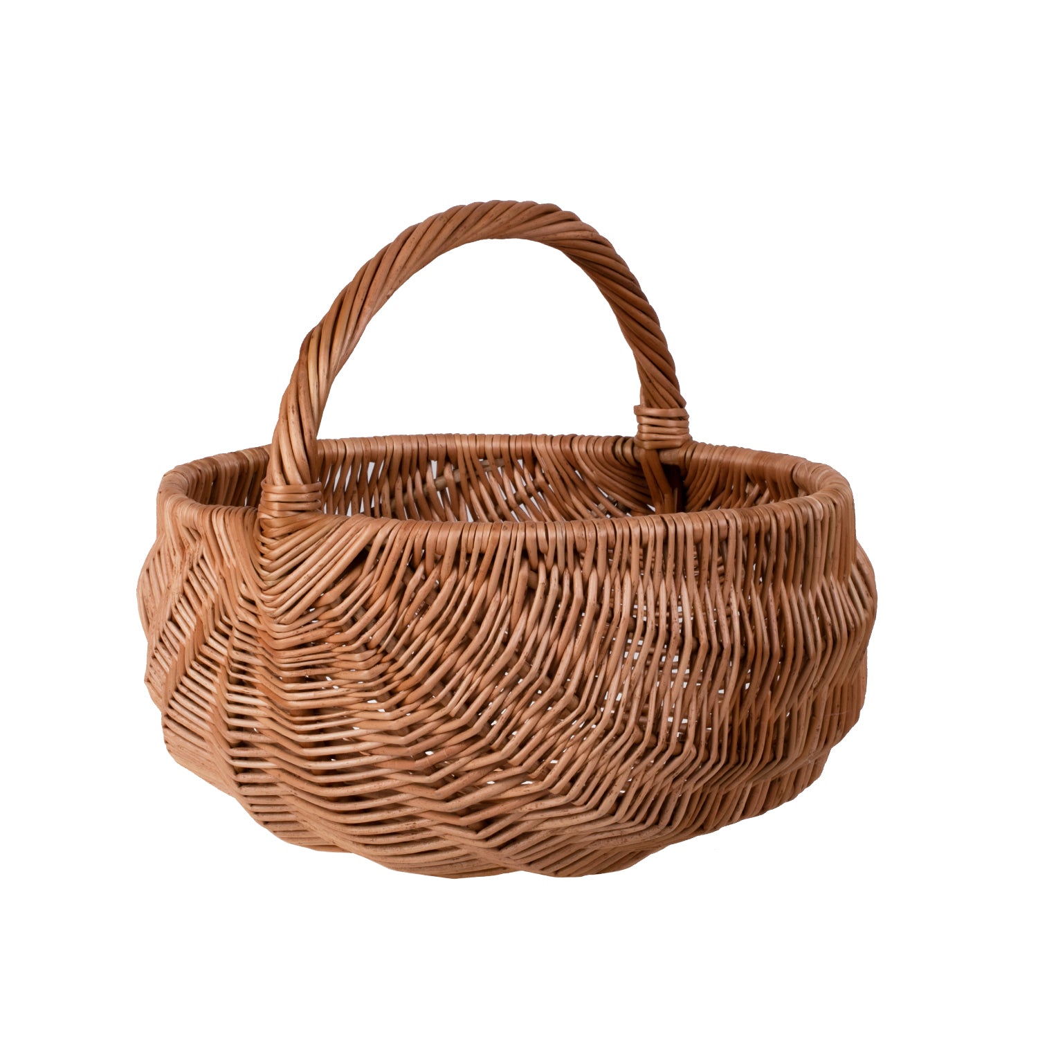 A classic wicker basket in a natural shade delights with its even, decorative weave and a pronounced turned rim. The harmonious, roomy body and the solidly woven, semicircular handle ensure a secure grip. The handle attachment points are reinforced with dense weaving for extra stability. The absence of trim and closure emphasizes the simplicity of the form, and carefully finished stem ends create a clean, elegant look.