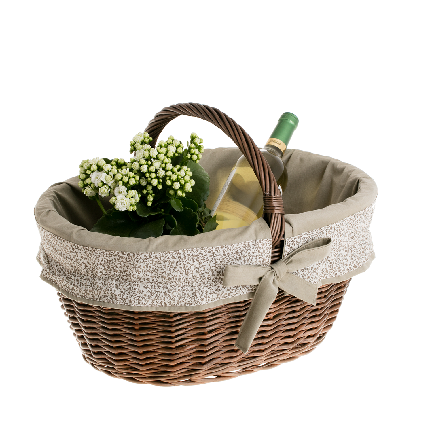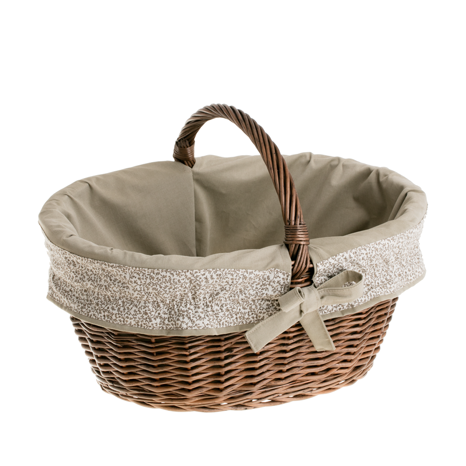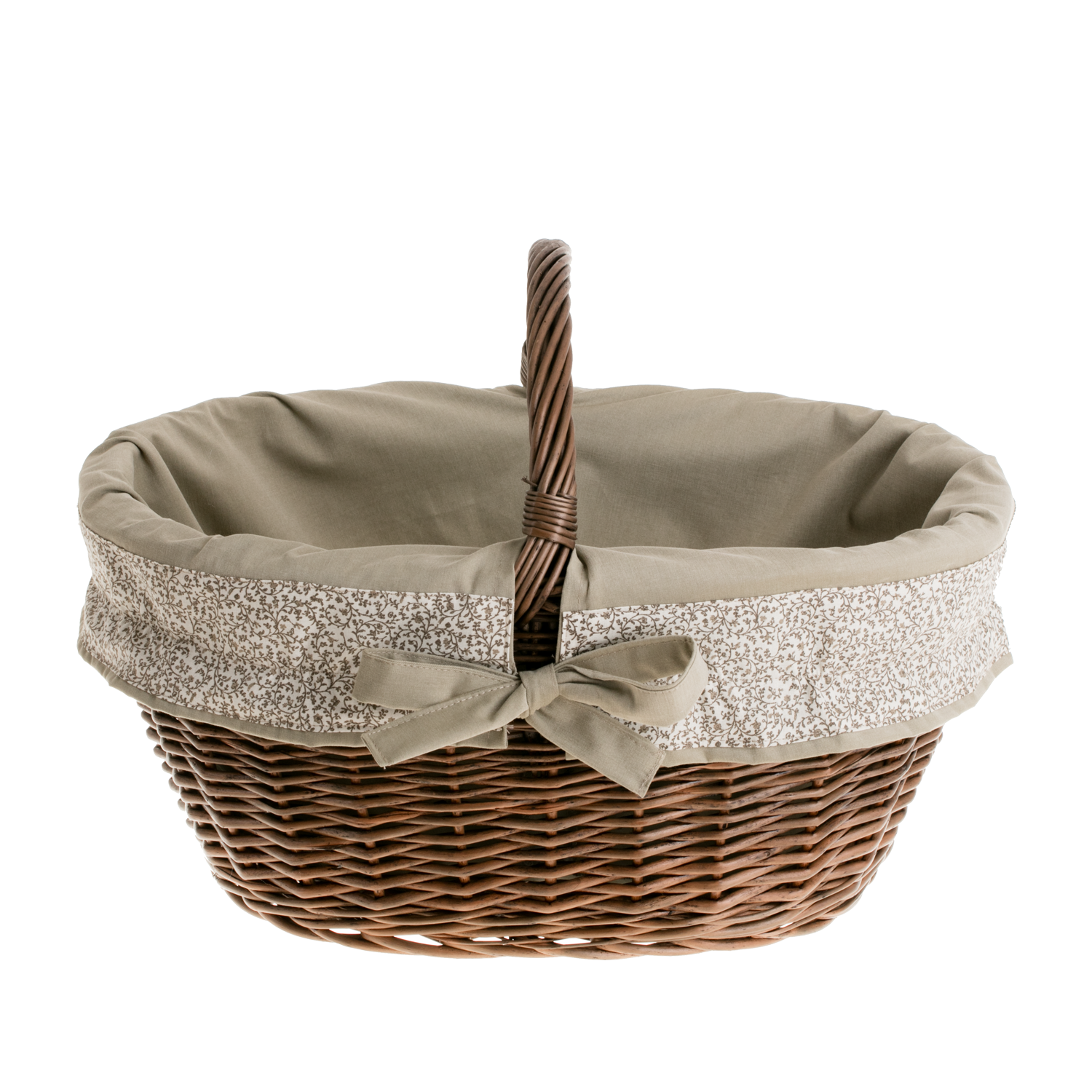 Elegancki, ręcznie pleciony wiklinowy kosz na zakupy zachwyca głębokim odcieniem ciemnego brązu i równym, solidnym splotem. Owalna forma z wyprofilowaną rączką zapewnia pewny chwyt podczas noszenia. Wewnątrz znajduje się miękkie, beżowe obszycie bawełniane z kokardą, które dodaje uroku i jednocześnie chroni zawartość przed otarciami. Obszycie jest zdejmowane i nadaje się do prania w pralce w temperaturze 30°C.