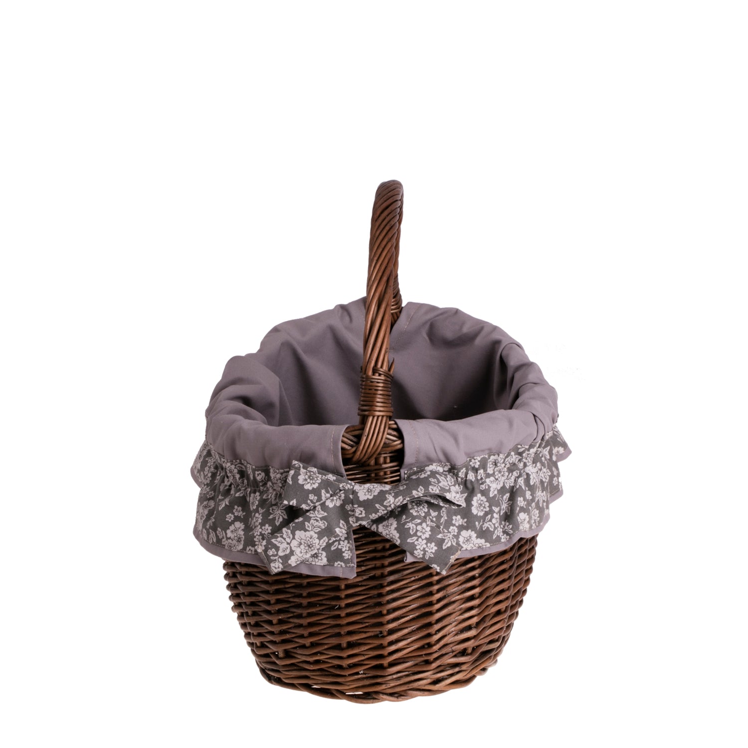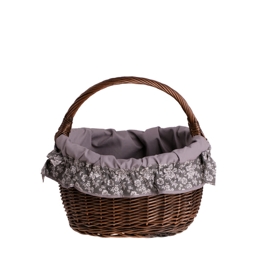 Ten wiklinowy kosz prezentuje się w głębokim, ciemnobrązowym odcieniu, który pięknie podkreśla gęsty, równy splot. Ma zgrabną, owalną linię i jedną, mocno wygiętą rączkę ułatwiającą przenoszenie. Wnętrze wyściełano miękkim, szarym obszyciem z bawełny z subtelną falbaną okalającą rant. Starannie wykończone krawędzie i stabilne dno podkreślają klasę. Całość utrzymana jest w eleganckiej, retro stylistyce pasującej zarówno do miejskich, jak i wiejskich klimatów.