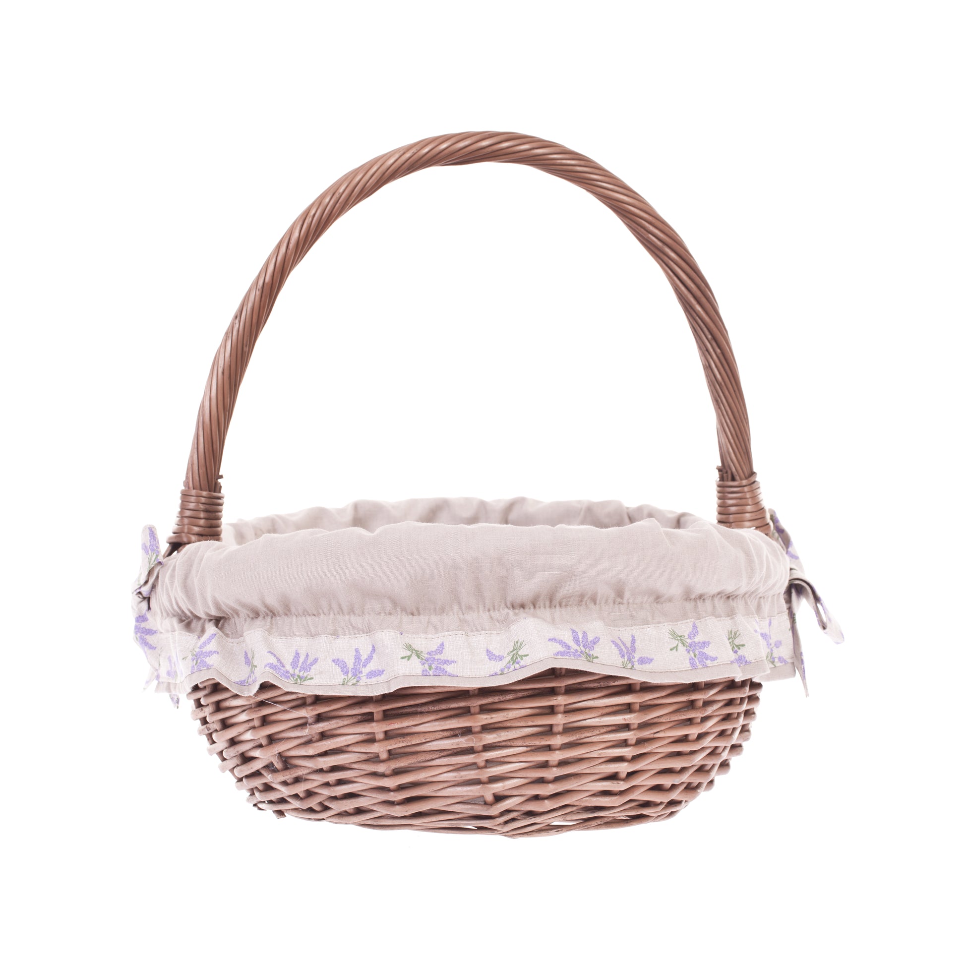 Klasyczny, ręcznie pleciony kosz wiklinowy w odcieniu ciemnego brązu zachwyca naturalnym urokiem. Ma wysoki, mocny uchwyt ułatwiający noszenie oraz gęsty, równy splot gwarantujący stabilność. Wnętrze wyłożono miękkim, kremowym obszyciem z subtelną falbanką i wiązaniami, które dodają elegancji i chronią zawartość przed otarciami. Obszycie jest zdejmowane i nadaje się do prania w pralce w temperaturze 30°C.