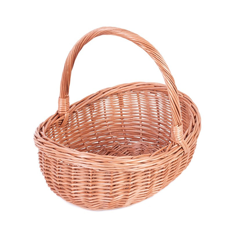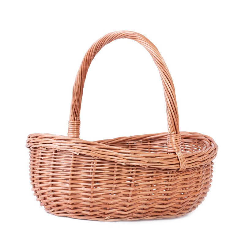 Atrakcyjny wiklinowy kosz na zakupy w ciepłym, miodowym odcieniu ma pojemne wnętrze i staranne wykończenie. Gęsty, równy splot dodaje mu stabilności, a wysoki pałąkowy uchwyt zapewnia pewny chwyt. Gładko wywinięty rant z dekoracyjnym oplotem oraz wzmocnione mocowania podkreślają dopracowane detale.