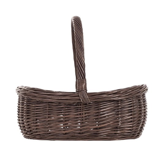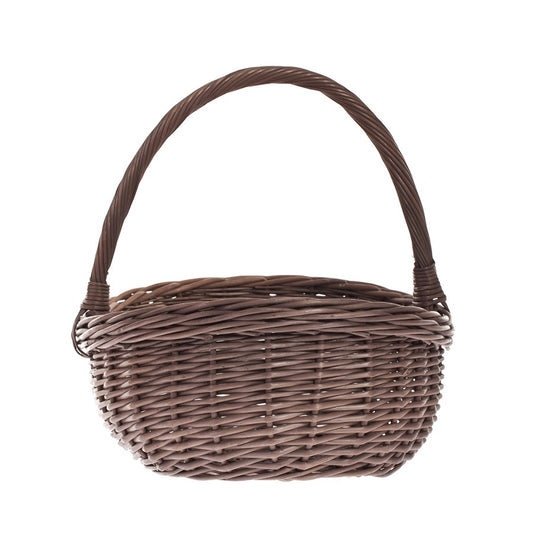 Klasyczny, ręcznie pleciony wiklinowy kosz na zakupy w odcieniu ciemny brąz łączy naturalny urok z dbałością o detale. Ma pojemną formę i solidnie wypleciony, wysoki pałąk z rączką, który pewnie leży w dłoni. Gęstszy splot przy dnie stabilizuje ładunek, a elegancki rant porządkuje krawędzie i nadaje całości lekkości. Delikatnie połyskliwe pręty podkreślają jego ponadczasowy charakter.