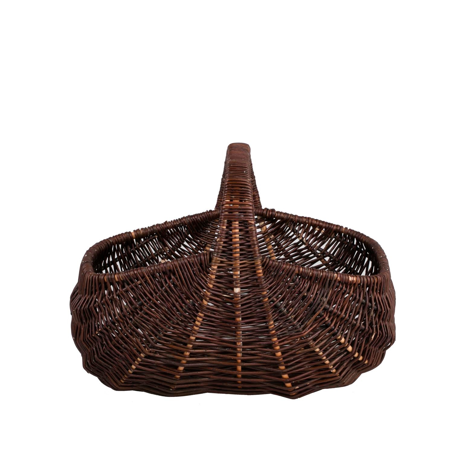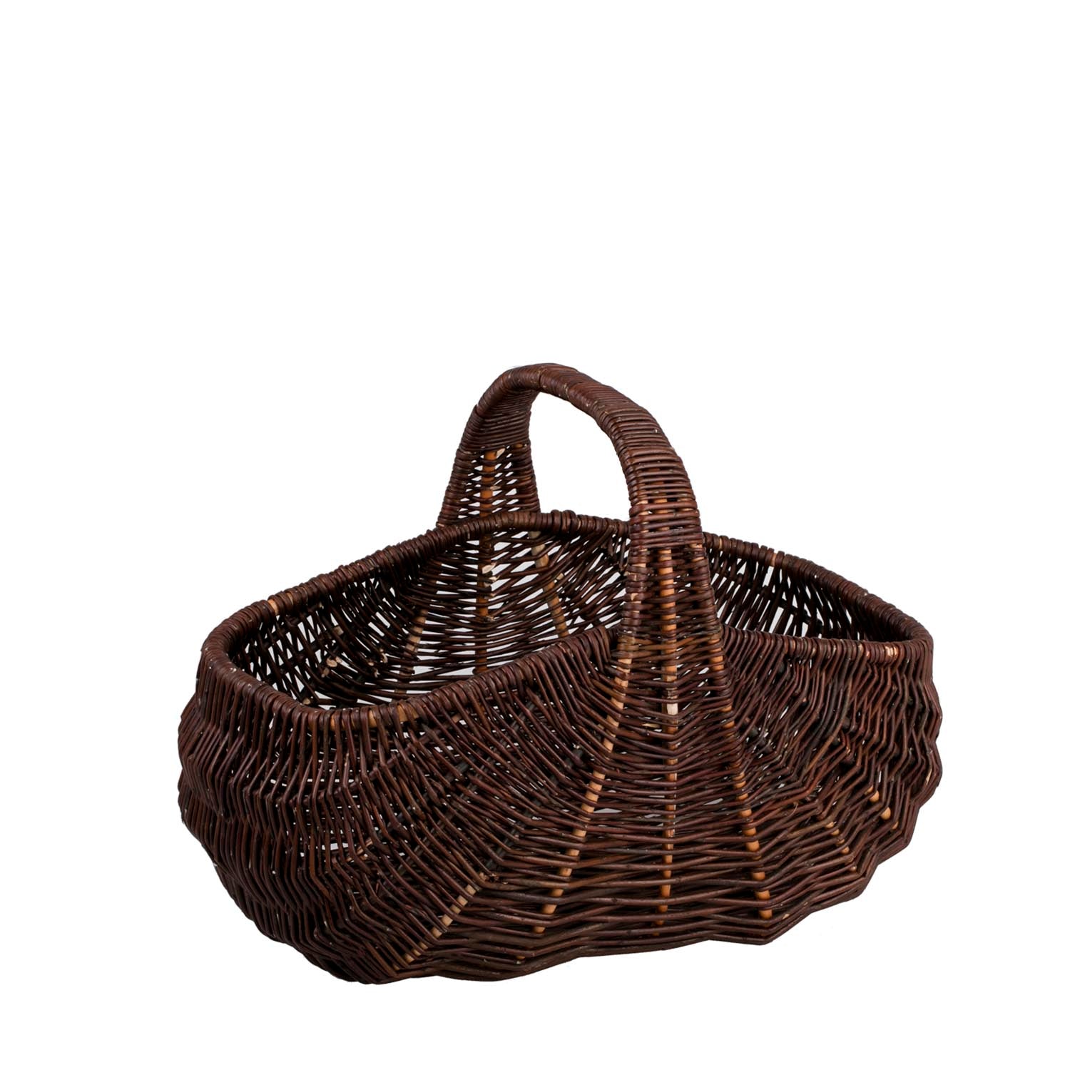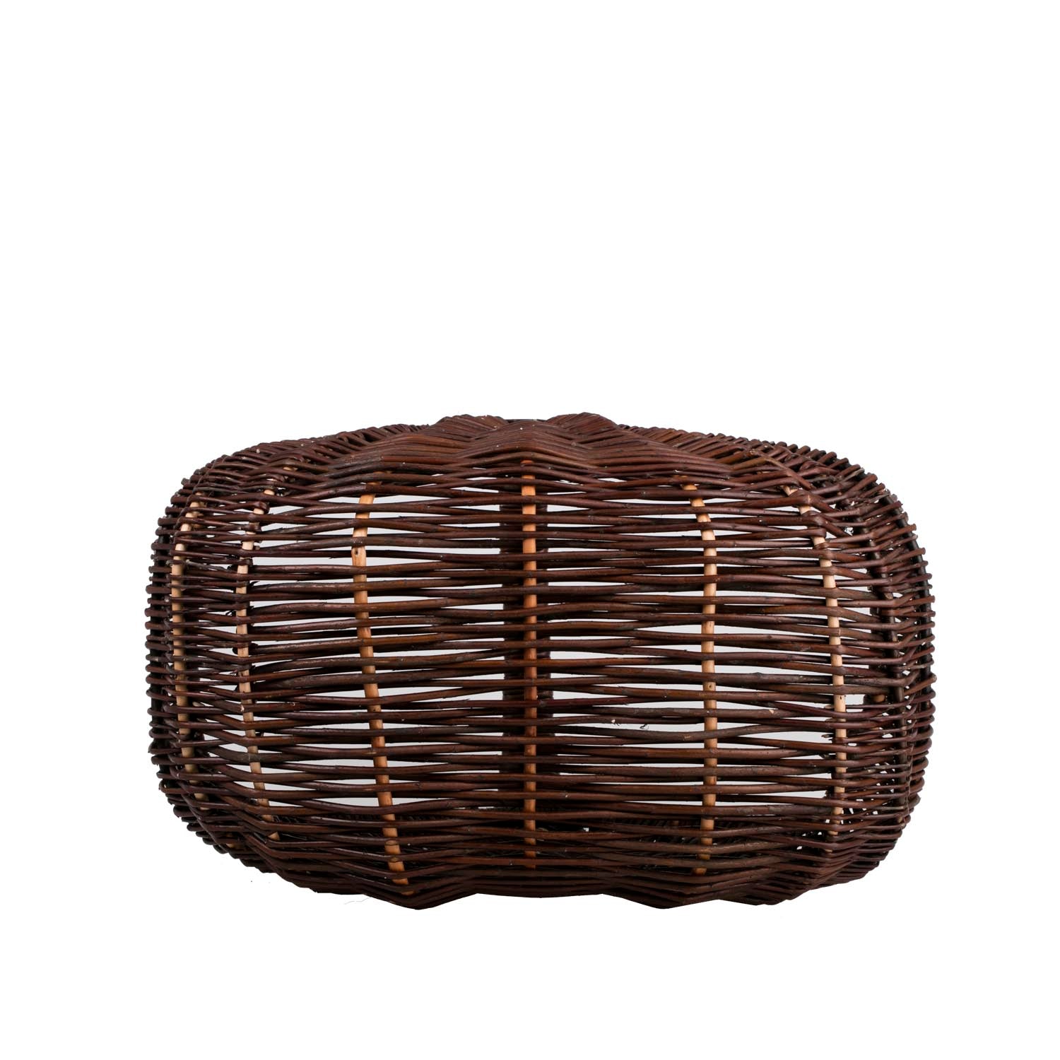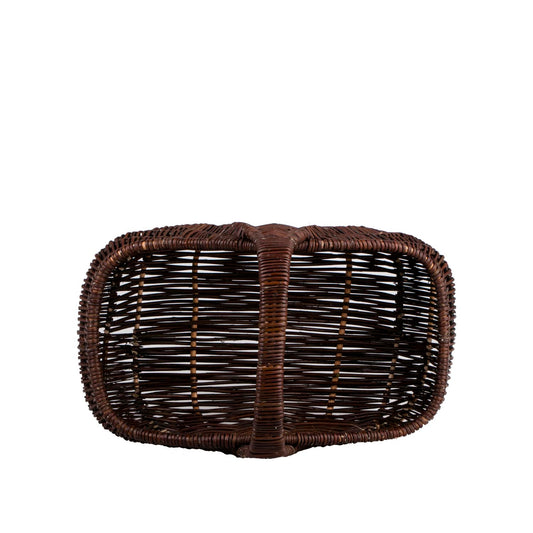 Elegancki kosz wiklinowy zachwyca głębokim odcieniem ciemnego brązu. Ma pojemną, wyprofilowaną formę i wysoki, stabilny uchwyt połączony z gładko wykończonym rantem. Równy, mięsisty splot oraz wzmocnienia biegnące od dna ku rączce dodają lekkości i trwałości. Zaokrąglone krawędzie są przyjemne w dotyku i bezpieczne dla zawartości.