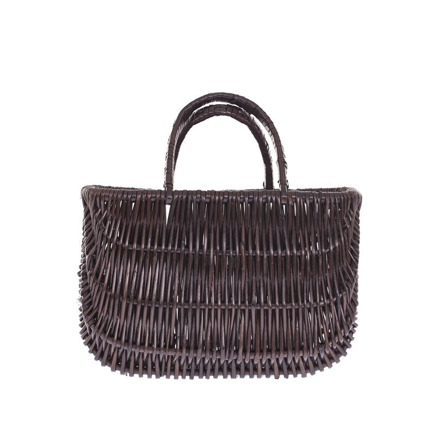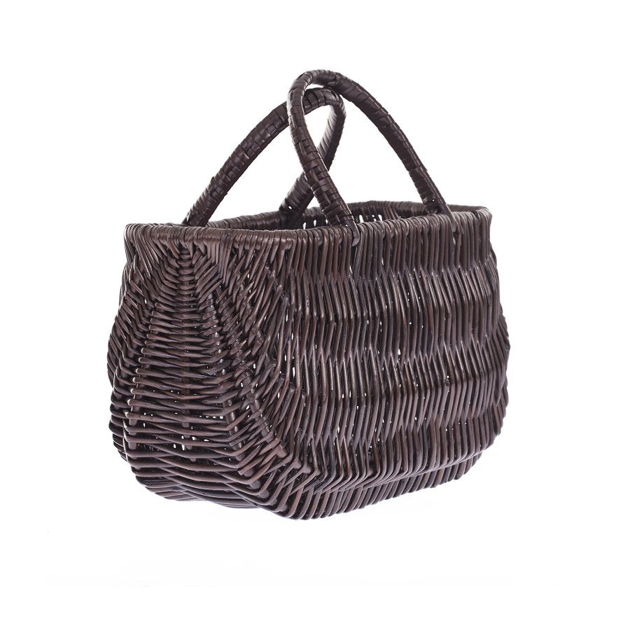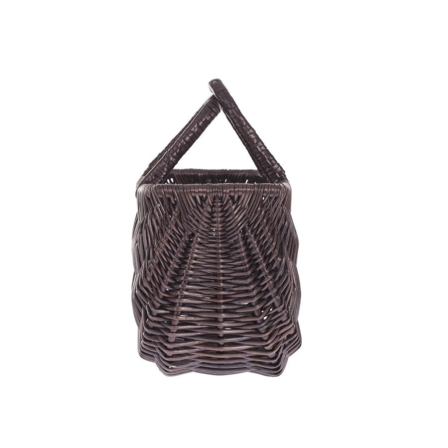 Ten wiklinowy kosz na zakupy w formie torby ma gęsty, falisty splot i podwójne, łukowate uchwyty. Rant jest starannie wywinięty, a ścianki płynnie przechodzą w stabilne dno. Ciemny brąz podkreśla naturalny charakter i pasuje do wielu stylów. Lekka, a zarazem solidna konstrukcja pewnie chroni zawartość.