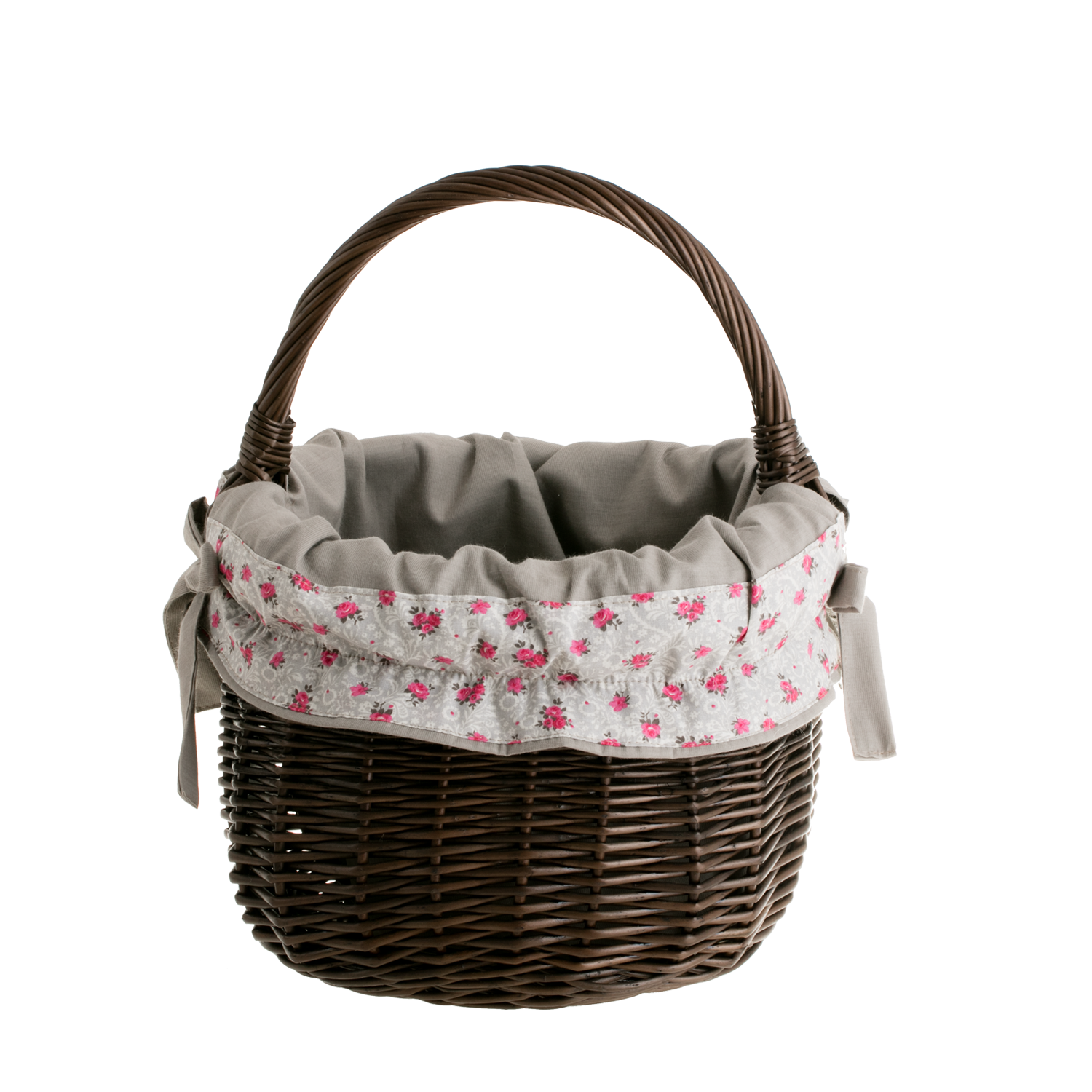 Ten elegancki wiklinowy kosz na zakupy ma głęboki korpus w odcieniu ciemnego brązu. Gęsty, równy splot i solidne, spiralnie skręcane ucho tworzą spójną całość, która dobrze leży w dłoni. Wnętrze wyłożono miękkim, szarym obszyciem z bawełny, wiązanym kokardkami dla pewnego trzymania zawartości. Zaokrąglony rant estetycznie okala obszycie, a wykończenie ma delikatny, półmatowy połysk. Obszycie można zdjąć i prać w pralce w temperaturze 30°C.