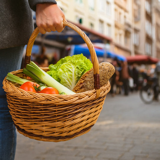 Jako kosz na zakupy sprawdzi się na targu i podczas codziennych sprawunków. Pojemne wnętrze oraz stabilne dno ułatwiają pakowanie, a wyprofilowana rączka pozwala wygodnie nieść kosz w dłoni lub na przedramieniu. Udźwig do 6 kg daje pewność przenoszenia warzyw, pieczywa, butelek oraz bukietów.