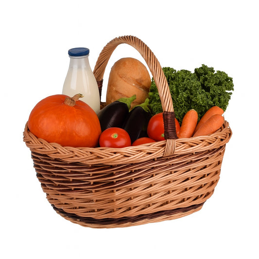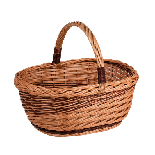 Klasyczny kosz wiklinowy na zakupy zachwyca rysunkiem splotu i kontrastem jasnych oraz ciemniejszych prętów. Ma otwartą, pojemną misę i starannie wypleciony, wzmacniany rant okalający całość. Wygięta rączka, opleciona ciemnym pasem, jest stabilna i wygodna, a równy uplot nadaje lekkości. Zaokrąglone krawędzie dbają o komfort noszenia.