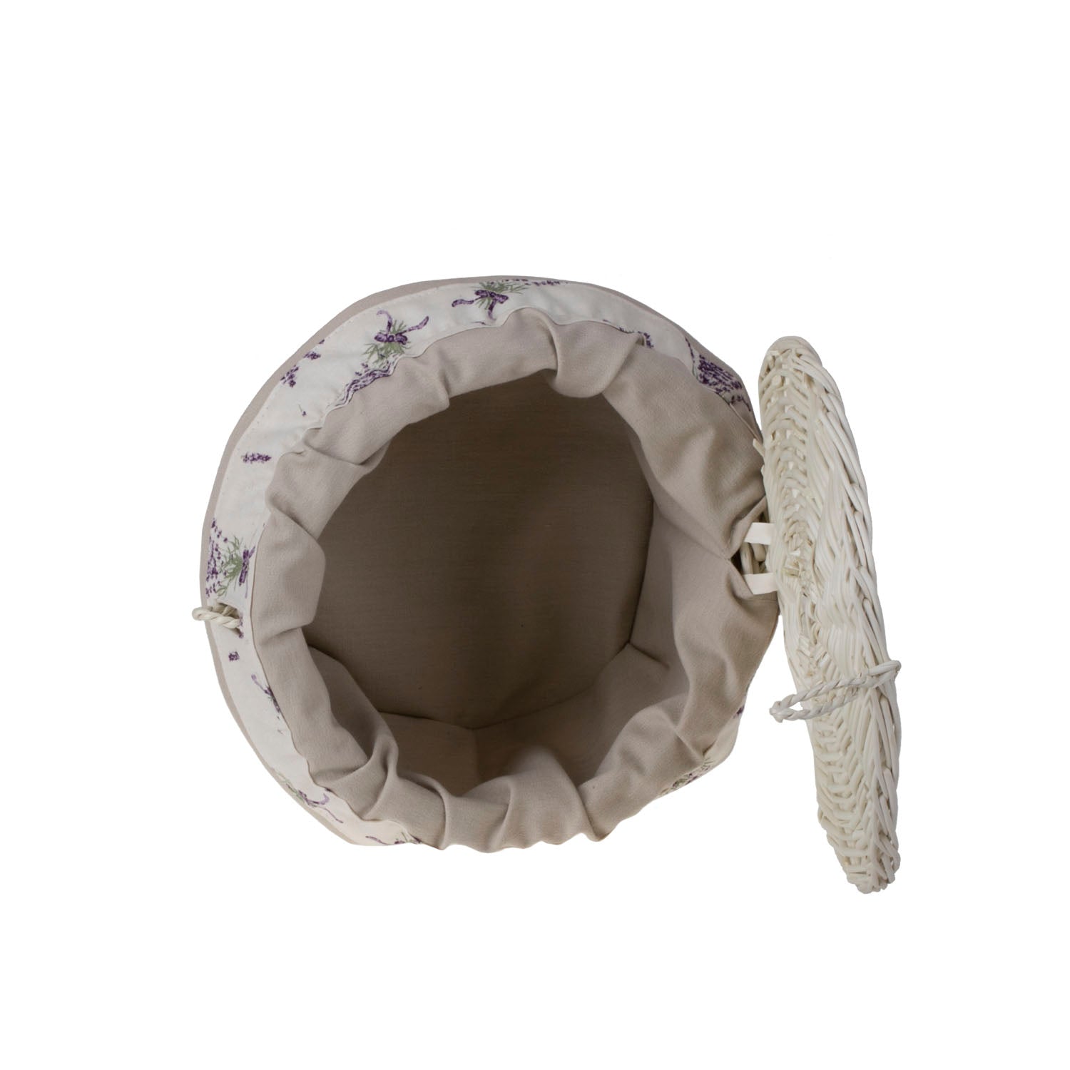 Ta urokliwa szkatułka z wikliny zachwyca jasną, kremową barwą i starannym splotem, który tworzy jednolitą, harmonijną powierzchnię. Płaska, solidnie dopasowana pokrywa również została wypleciona, dzięki czemu całość wygląda lekko i elegancko. Górną krawędź zdobi materiałowe, kremowe obszycie oraz dekoracyjna kokarda, dodające subtelnego charakteru i miękkiego wykończenia. Efektowna bordiura podkreśla rękodzielniczy styl produktu i sprawia, że pojemnik pięknie prezentuje się na widoku. Obszycie można zdjąć i prać w pralce w temperaturze 30°C, a kosz wystarczy przetrzeć wilgotną szmatką.