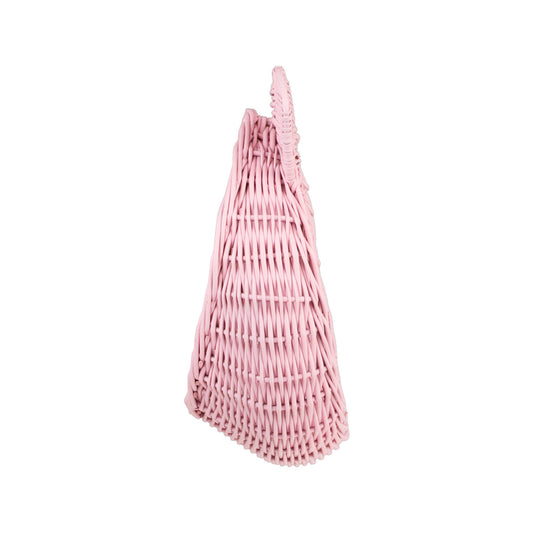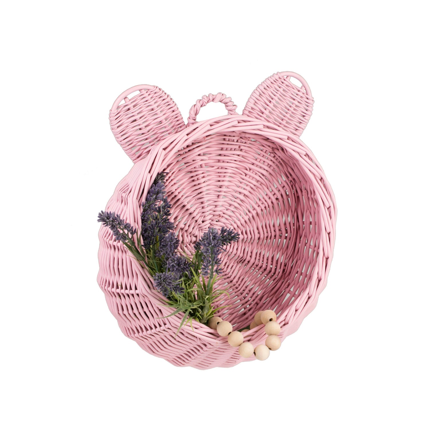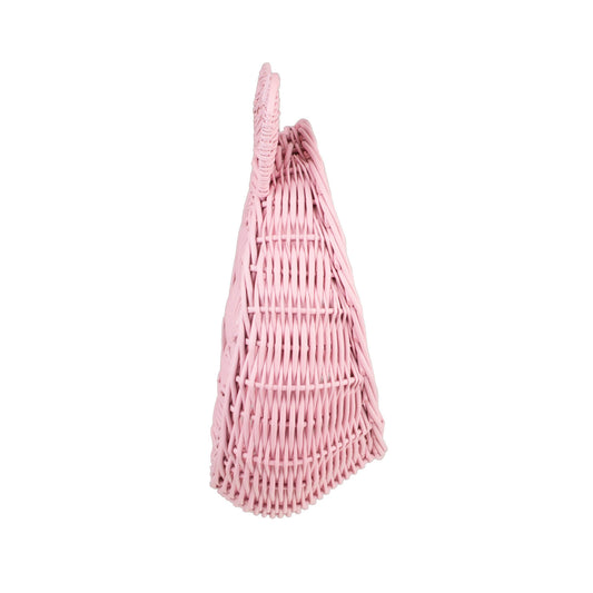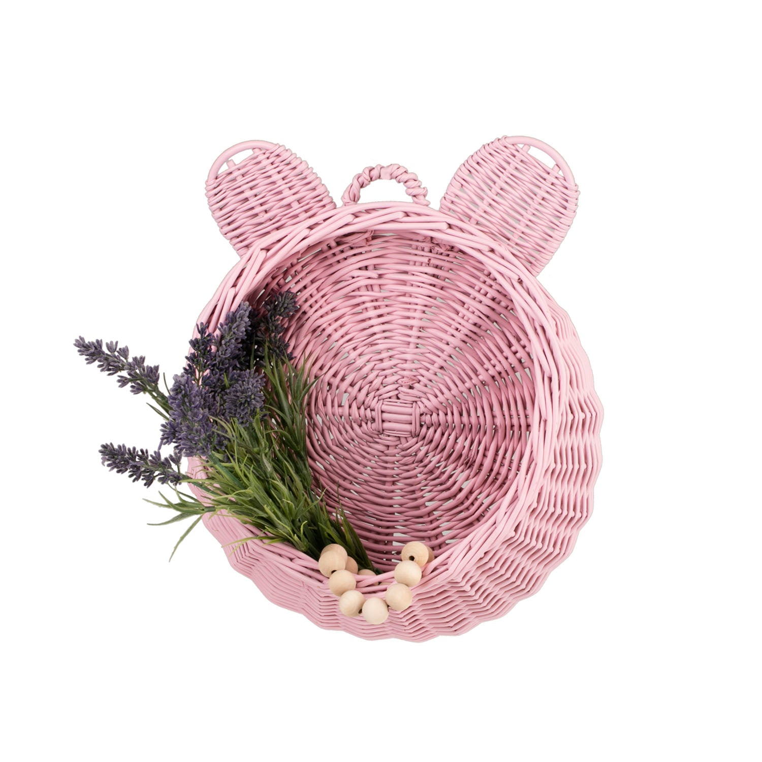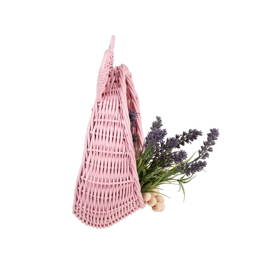 Delikatny wiklinowy kosz do zawieszenia zachwyca subtelną, pastelowo różową barwą i dopracowanym splotem. Okrągła misa z dekoracyjną, lekko falowaną krawędzią oraz dwie zaokrąglone wypustki tworzą pogodny motyw misia. Na górze znajduje się poręczna pętelka, która ułatwia zawieszenie na haczyku. Krawędzie są równo wykończone, a kosz zachowuje miłą w dotyku, łagodnie zaokrągloną linię.