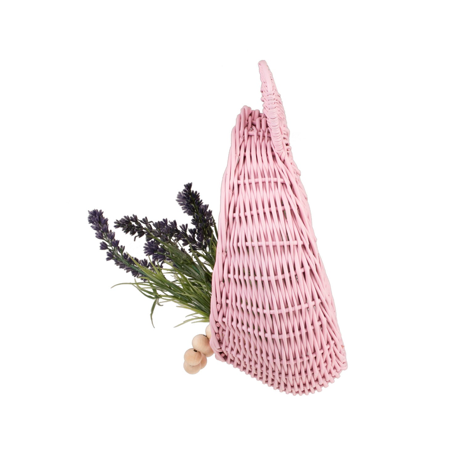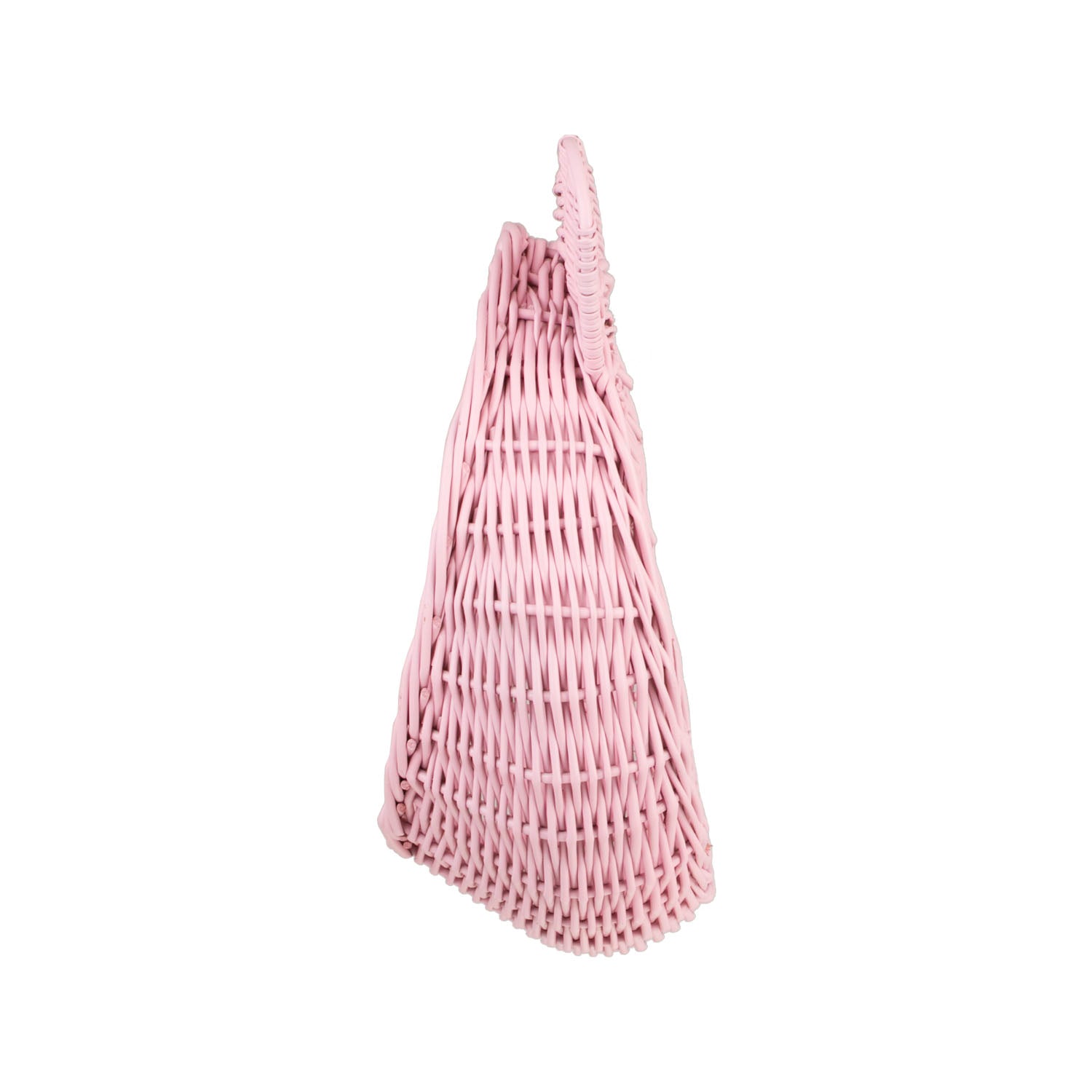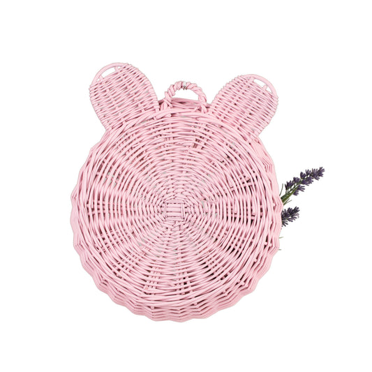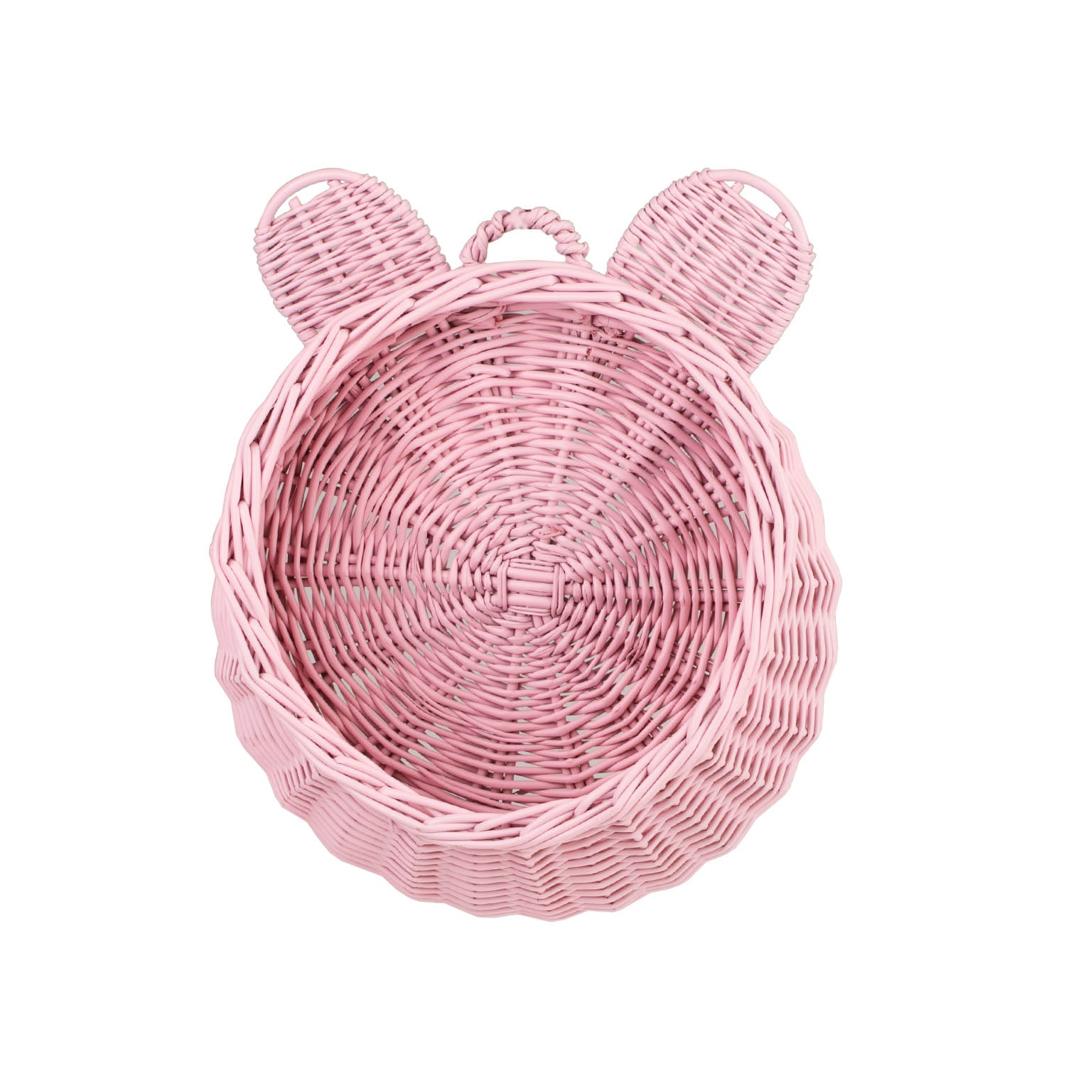 Delikatny wiklinowy kosz do zawieszenia zachwyca subtelną, pastelowo różową barwą i dopracowanym splotem. Okrągła misa z dekoracyjną, lekko falowaną krawędzią oraz dwie zaokrąglone wypustki tworzą pogodny motyw misia. Na górze znajduje się poręczna pętelka, która ułatwia zawieszenie na haczyku. Krawędzie są równo wykończone, a kosz zachowuje miłą w dotyku, łagodnie zaokrągloną linię.