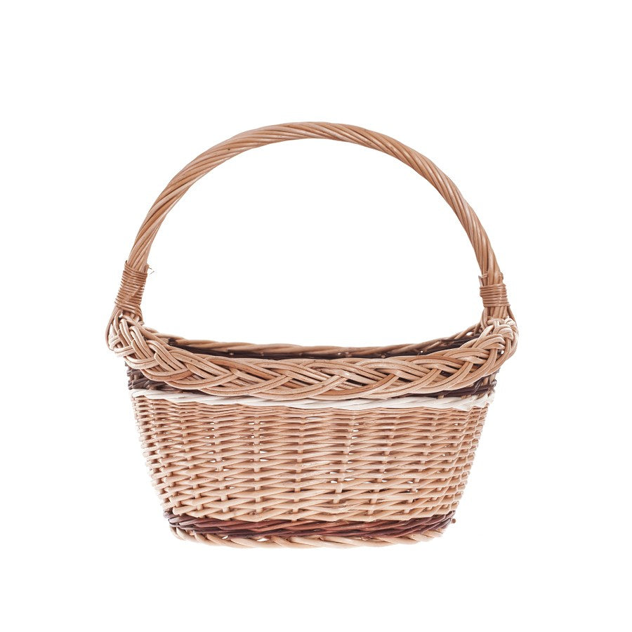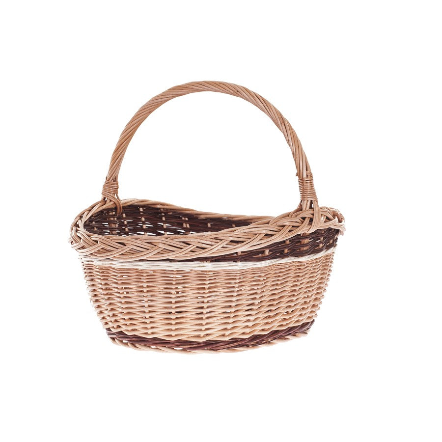 Ten elegancki kosz wiklinowy zachwyca naturalnym wyglądem i dopracowanymi detalami. Ma zgrabną linię z owalnym dnem, które zapewnia świetną stabilność podczas odkładania. Wysoki, stały uchwyt wygodnie leży w dłoni i ułatwia przenoszenie nawet wypełnionego kosza. Brzeg wykończono efektownym, warkoczowym „kranzem”, a równy, koszykowy splot tworzą pasy z jasnej i ciemniejszej wikliny, dodające całości dekoracyjnego charakteru.