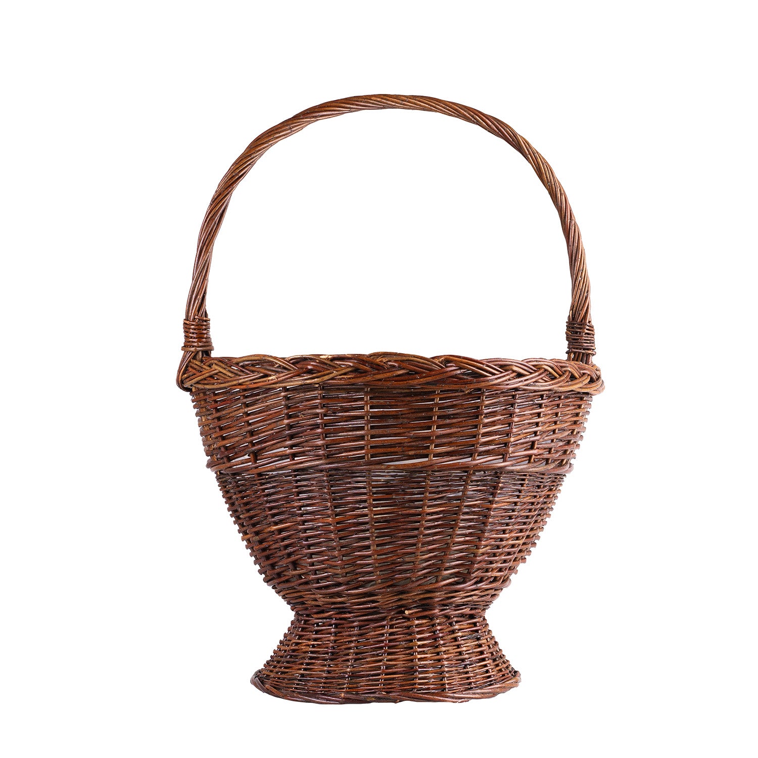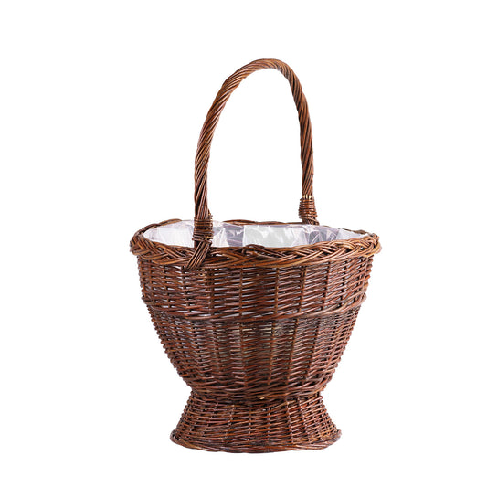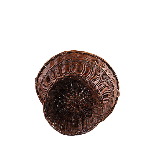 Ten kosz wiklinowy zachwyca eleganckim, rzemieślniczym wykończeniem i barwą ciemnego brązu. Wysoki, skręcany uchwyt jest solidnie przymocowany, a górna krawędź zdobiona dekoracyjnym warkoczem. Korpus ma szeroki wlot, smuklejszą dolną partię na stabilnej podstawie i równy, gęsty splot. Wewnątrz znajduje się przezroczysta folia chroniąca przed wilgocią.
