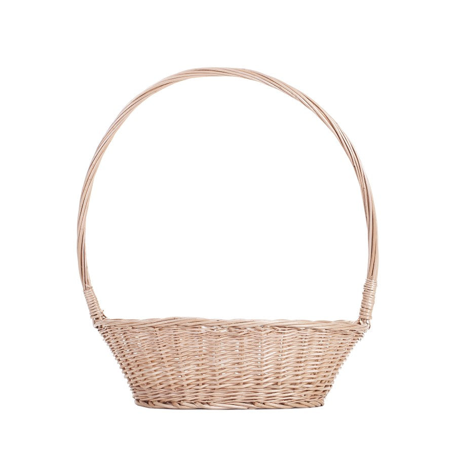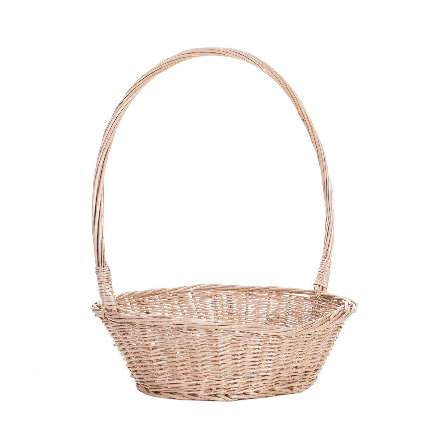 Klasyczny wiklinowy kosz prezentowy zachwyca lekkim, naturalnym odcieniem i starannym splotem. Owalna misa z delikatnie wyższym brzegiem z tyłu tworzy wygodną przestrzeń do układania kompozycji. Wysoki, łukowaty uchwyt jest gładko wykończony i stabilnie łączy się z brzegiem, dzięki czemu całość wygląda elegancko i harmonijnie.