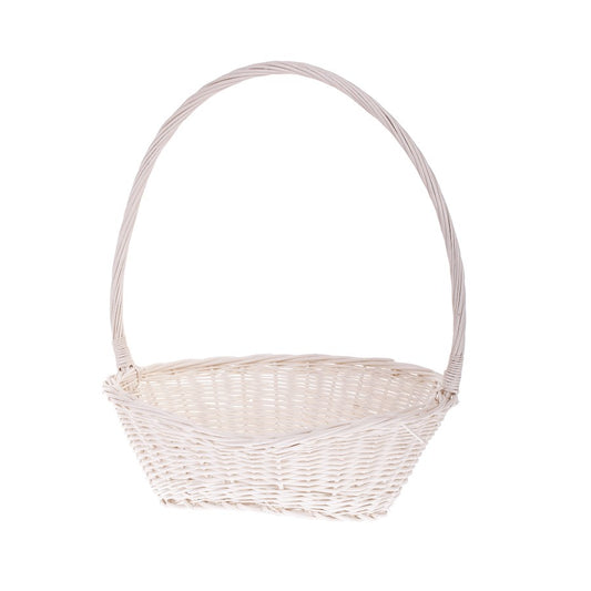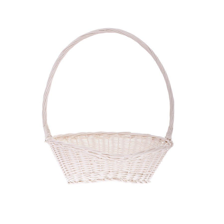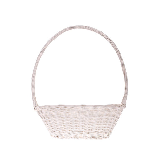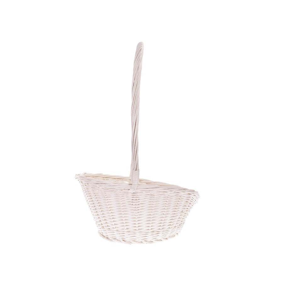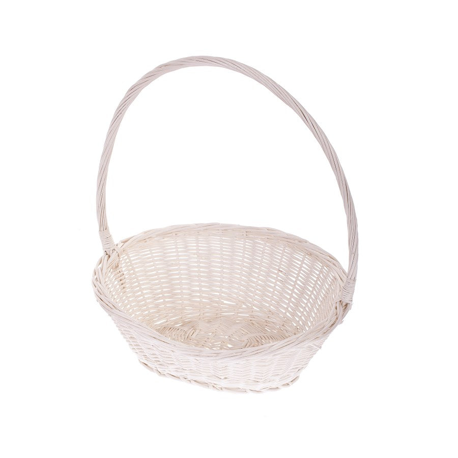 Ten elegancki kosz wiklinowy ma lekko owalną formę z delikatnie wyższą krawędzią z tyłu, która pięknie eksponuje zawartość. Uwagę zwraca wysoka, stabilna rączka wygięta w łuk, ułatwiająca przenoszenie i układanie kompozycji. Kremowy kolor dodaje lekkości, a równy, ciasny splot podkreśla precyzję wykonania. Krawędź zwieńczono dekoracyjnym warkoczem, a dno jest stabilne, dzięki czemu kosz pewnie stoi na stole.